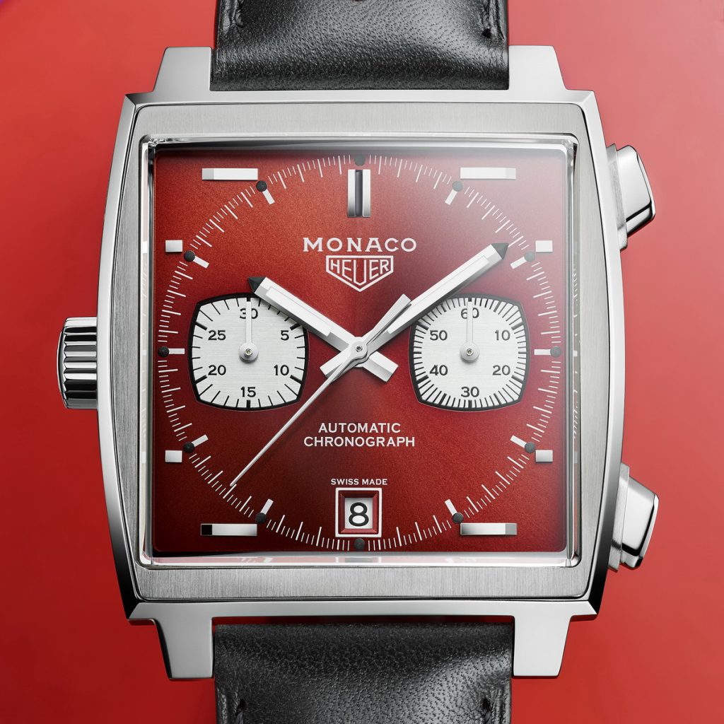 On Friday, June 14, 2019, as part of the 24 Hours of Le Mans weekend, TAG Heuer has introduced the second 50th Anniversary Limited Edition Monaco, this one representing the decade of the 1980s.  The dial is red, with a starburst finish, and two gray registers.  The registers are outlined in black, with black also being used for the hour markers on the dial and the triangular tips of the hands.
