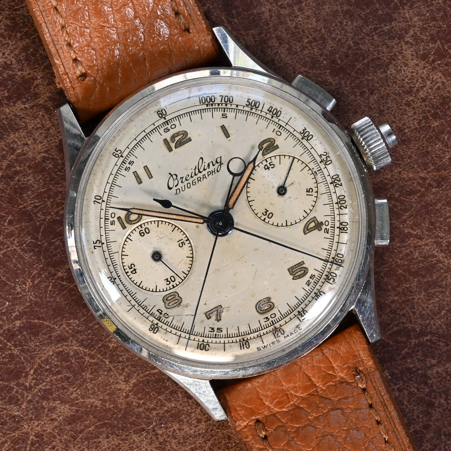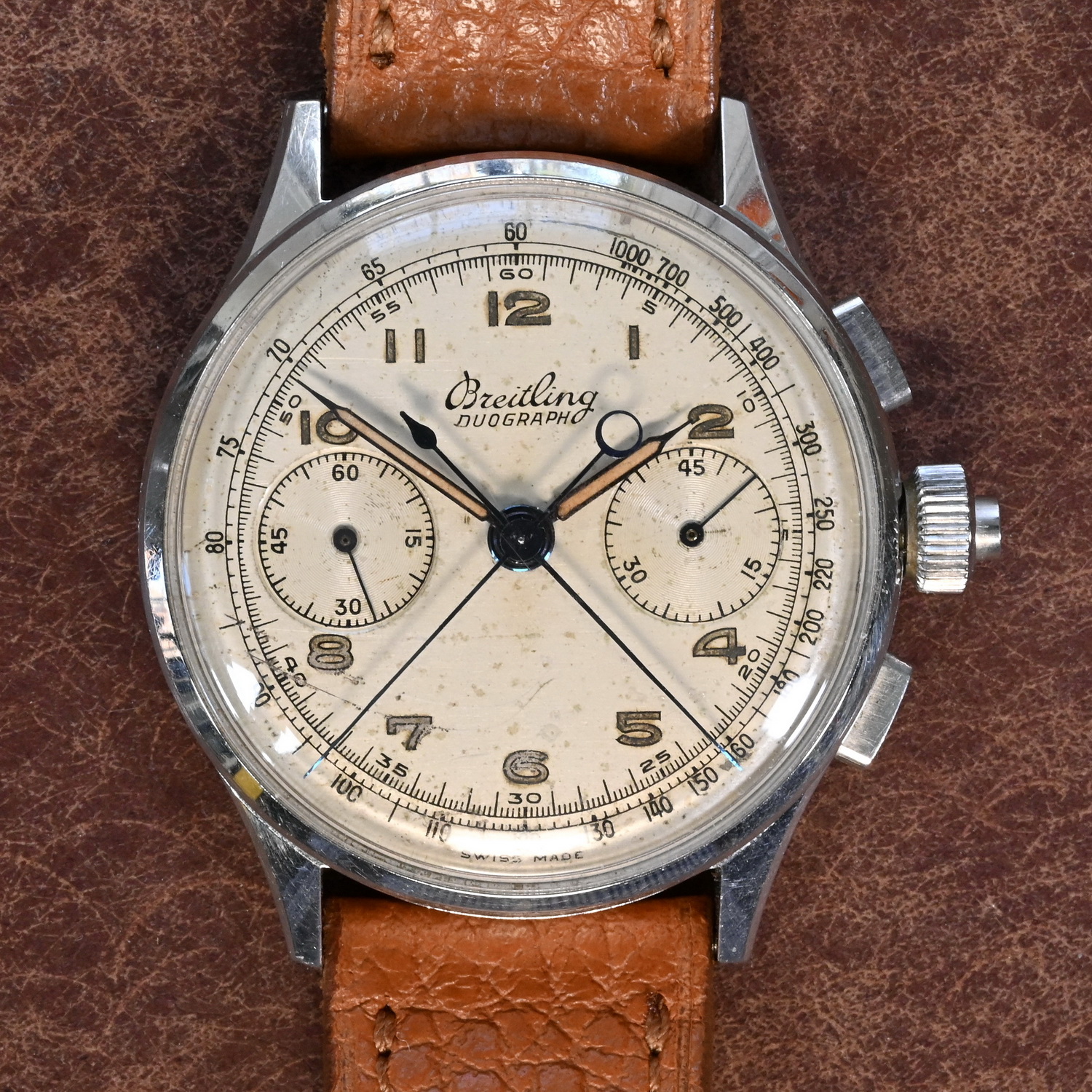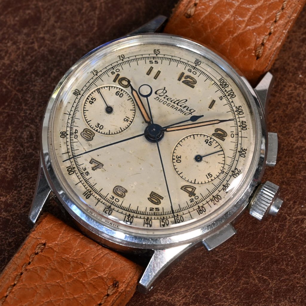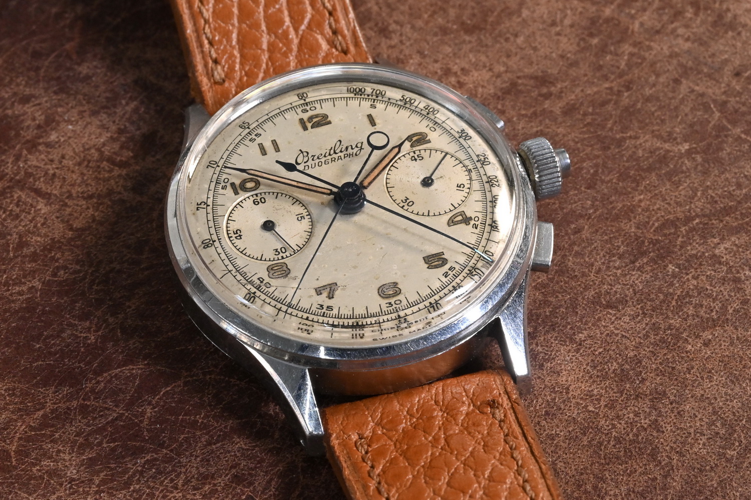 Willy Breitling showed his first split-second chronograph for the wrist (named the “Duograph”) in the company’s 1940 catalog, but assembling these complicated chronographs for serial production must have proven to be difficult. It was only in 1943 that the Breitling Duograph would enter serial production, with the first model being the Reference 762, a 36 millimeter chronograph powered by the Venus 179 movement.