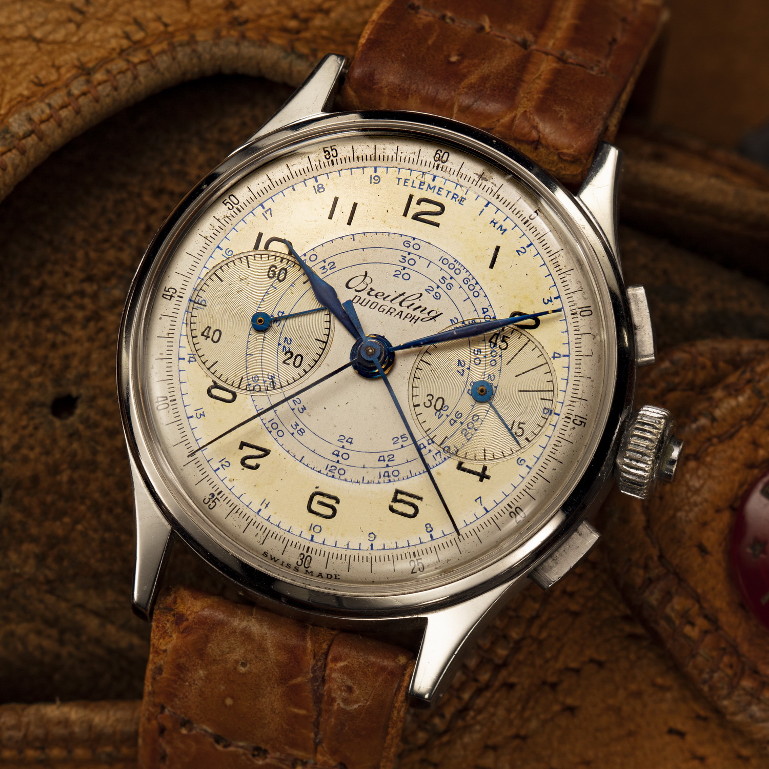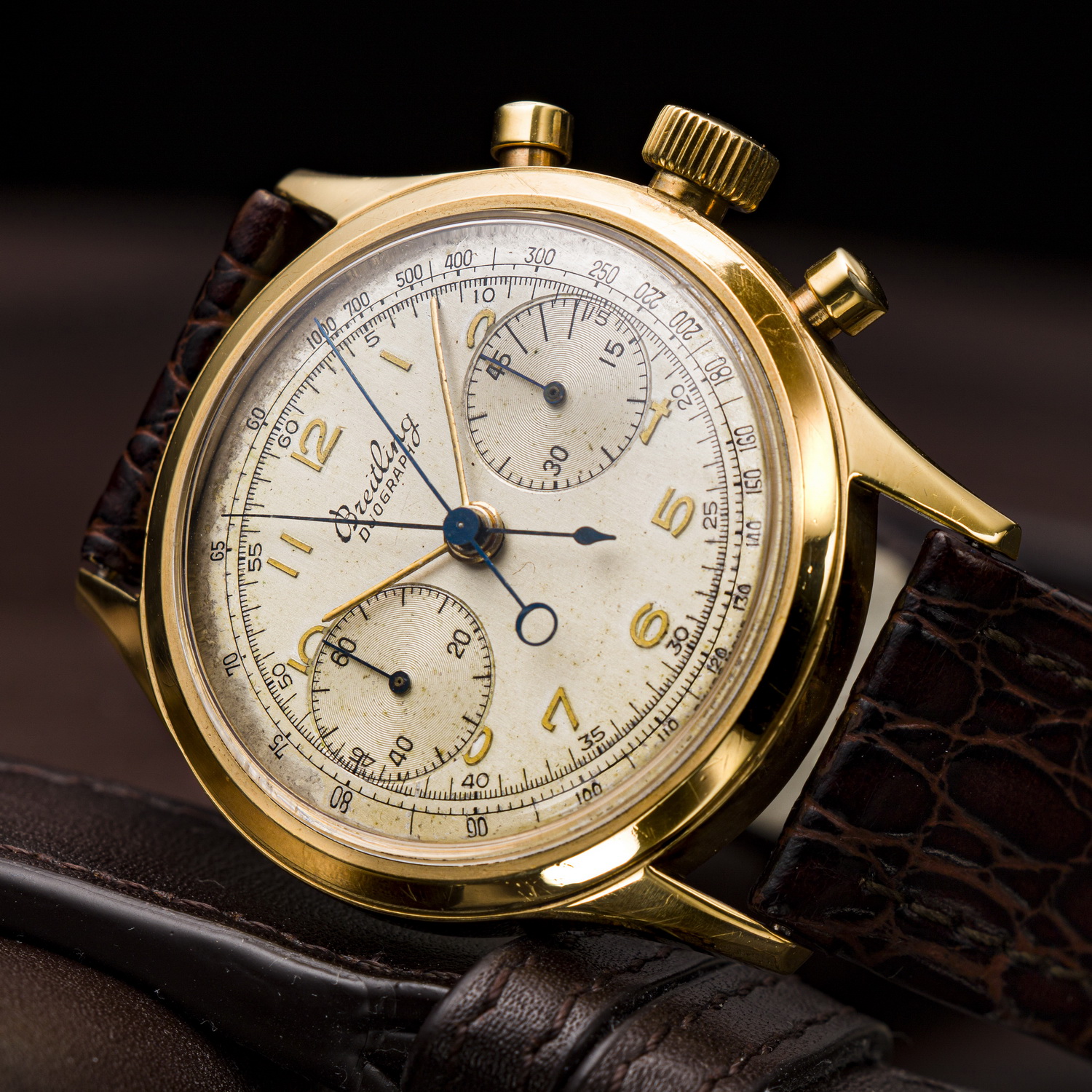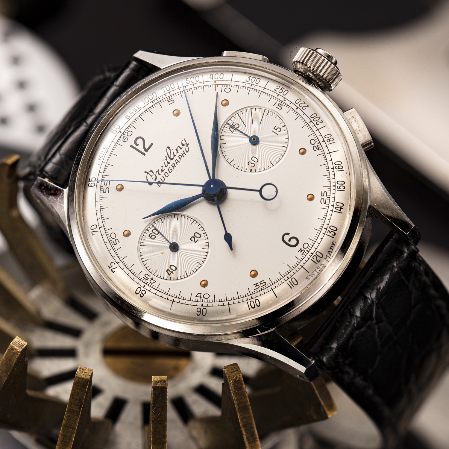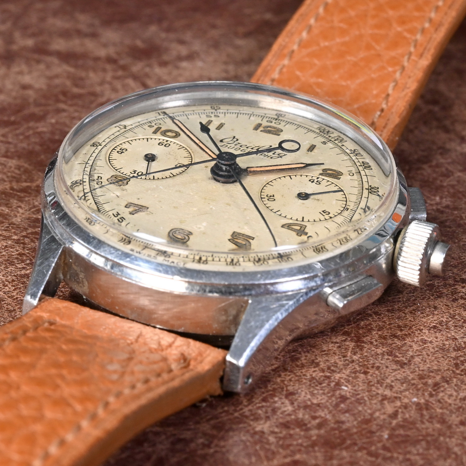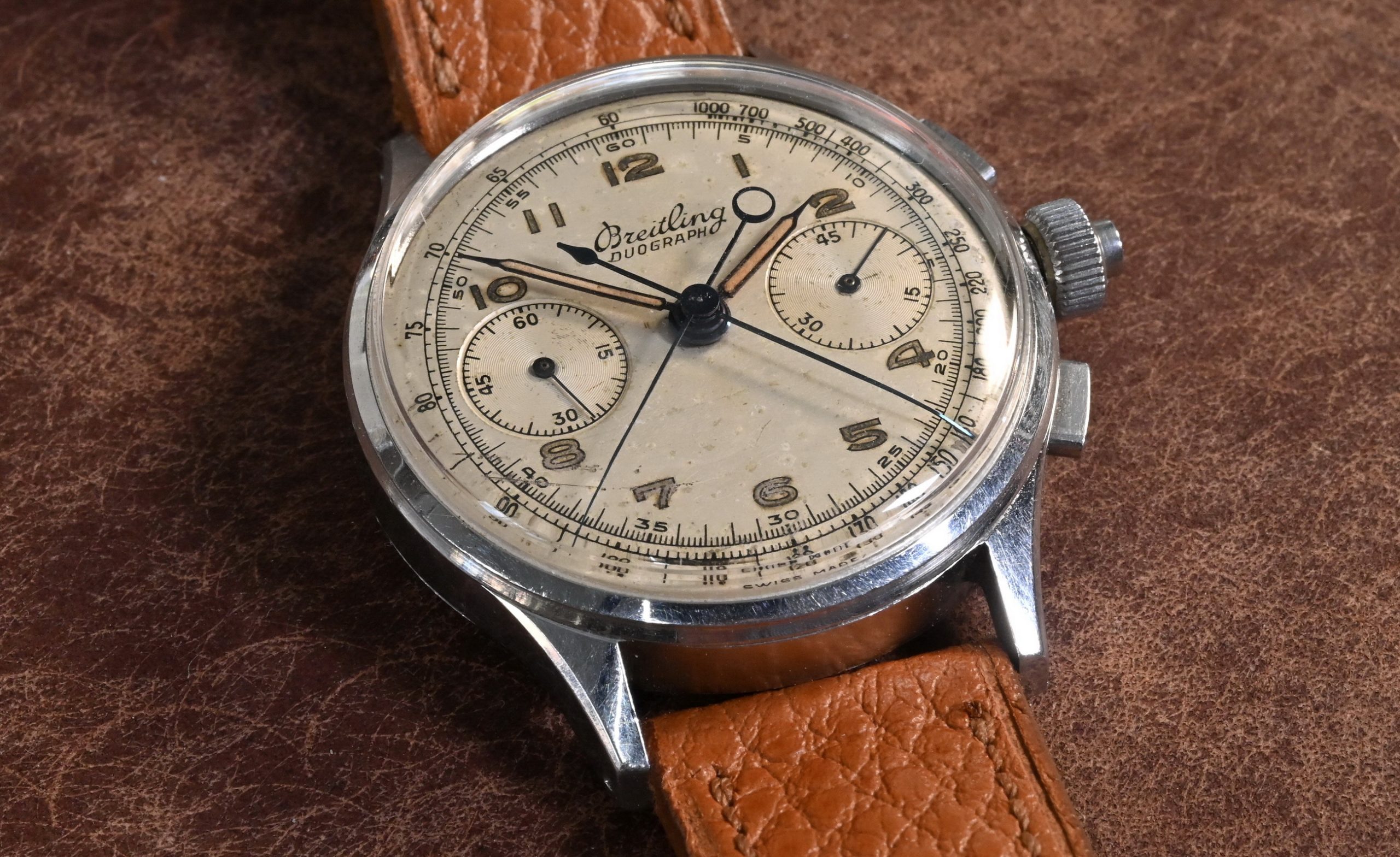Willy Breitling showed his first split-second chronograph for the wrist (named the “Duograph”) in the company’s 1940 catalog, but assembling these complicated chronographs for serial production must have proven to be difficult. It was only in 1943 that the Breitling Duograph would enter serial production, with the first model being the Reference 762, a 36 millimeter chronograph powered by the Venus 179 movement.