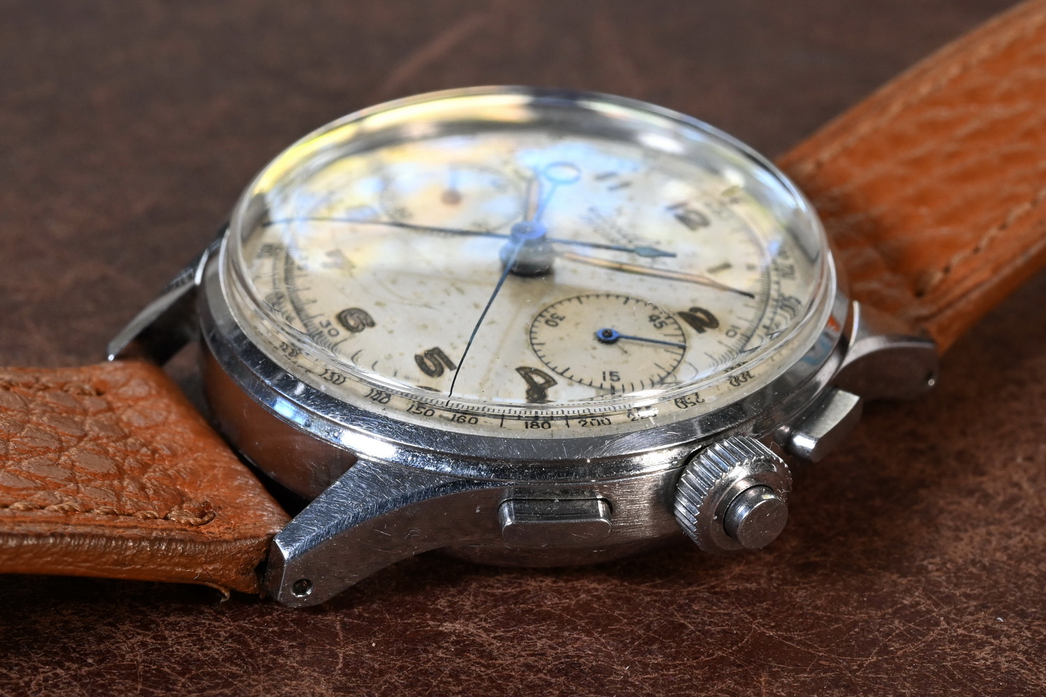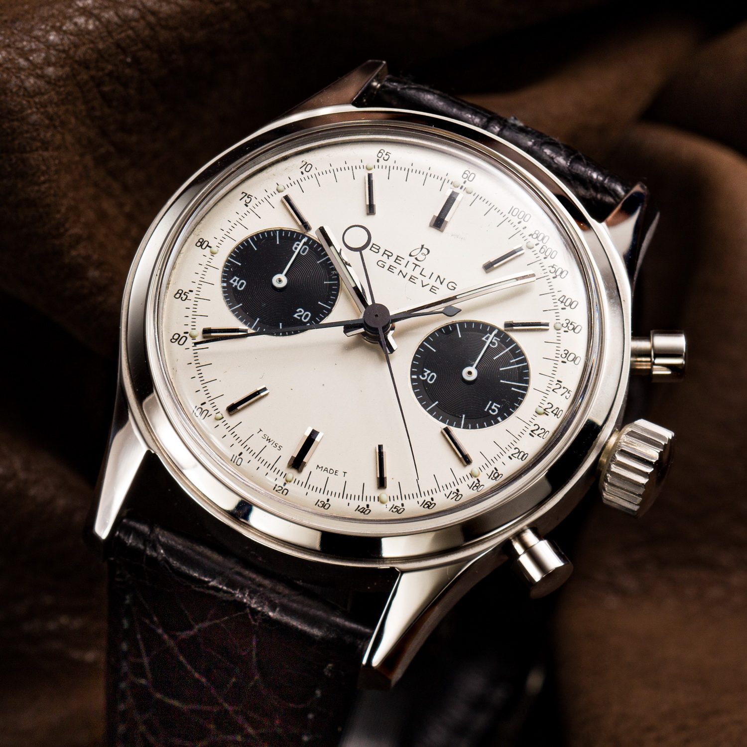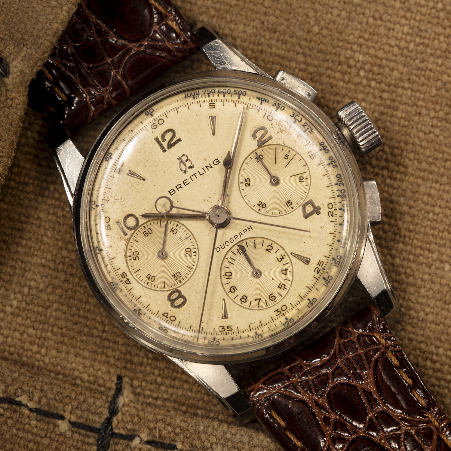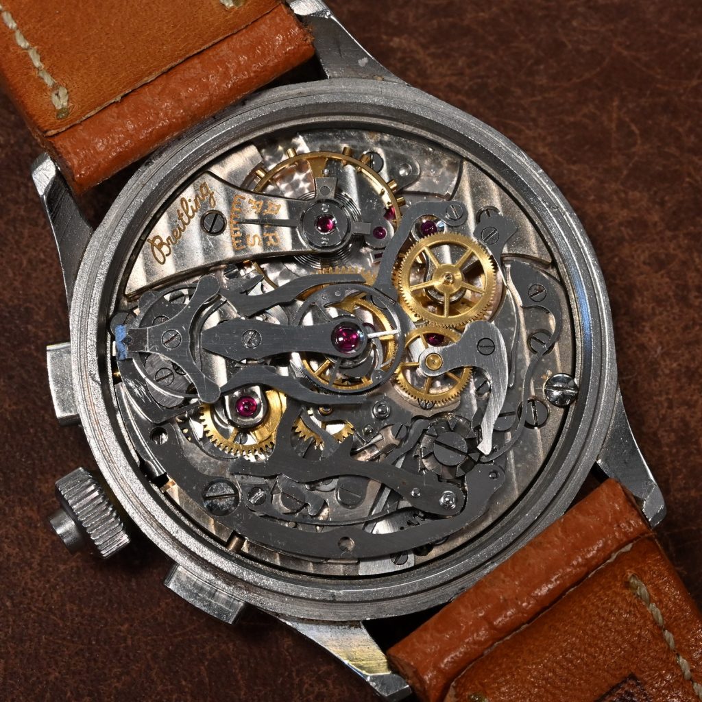 Willy Breitling showed his first split-second chronograph for the wrist (named the “Duograph”) in the company’s 1940 catalog, but assembling these complicated chronographs for serial production must have proven to be difficult. It was only in 1943 that the Breitling Duograph would enter serial production, with the first model being the Reference 762, a 36 millimeter chronograph powered by the Venus 179 movement.