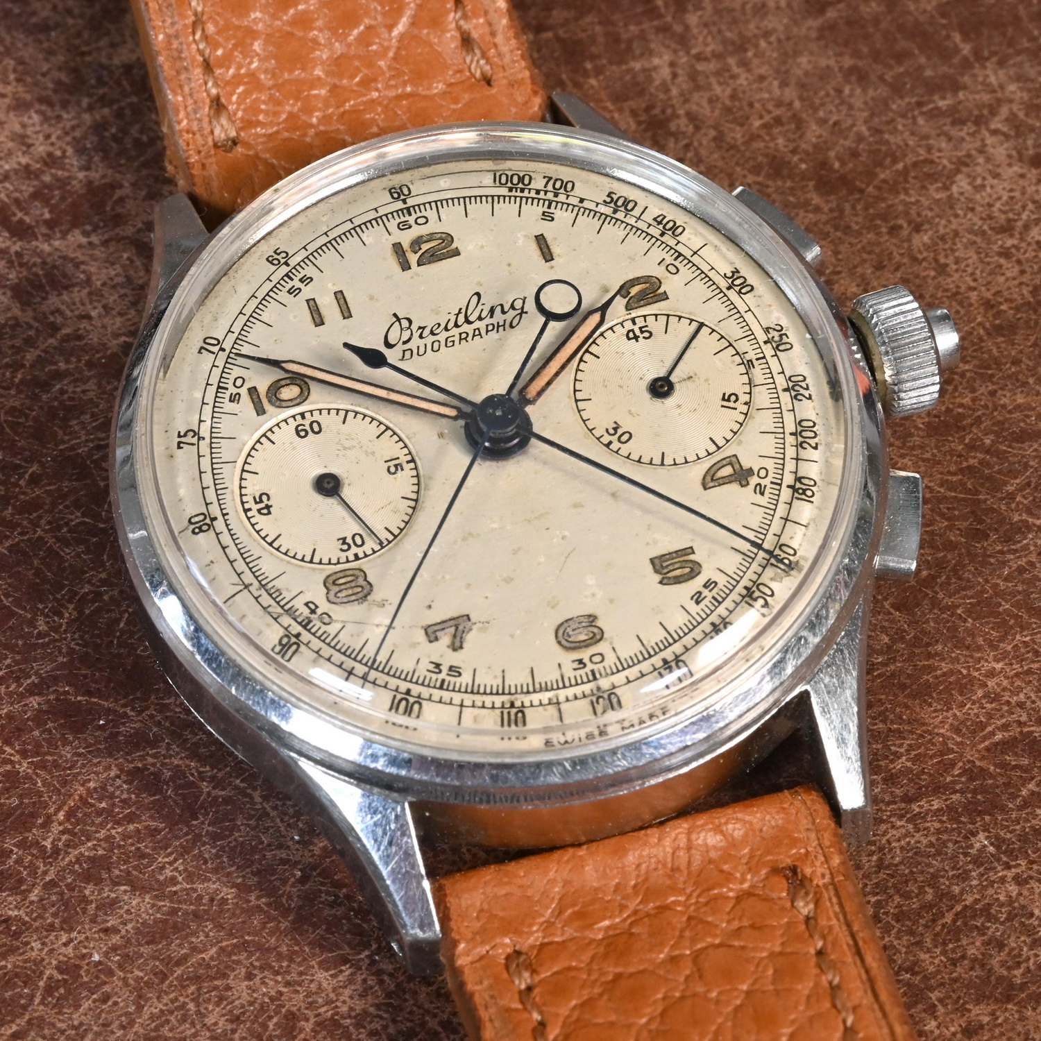 The Breitling Duograph chronograph featured in this posting (shown above) is from early 1943, likely one of the first Duographs produced by Breitling. This particular watch has a tachymeter scale printed on the dial, an element often associated with racing and motorsports.