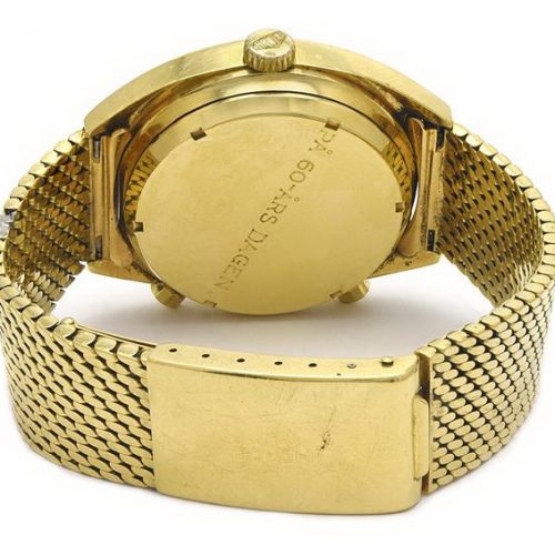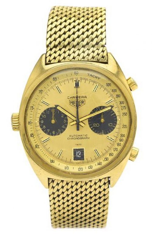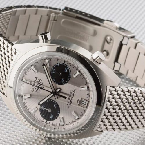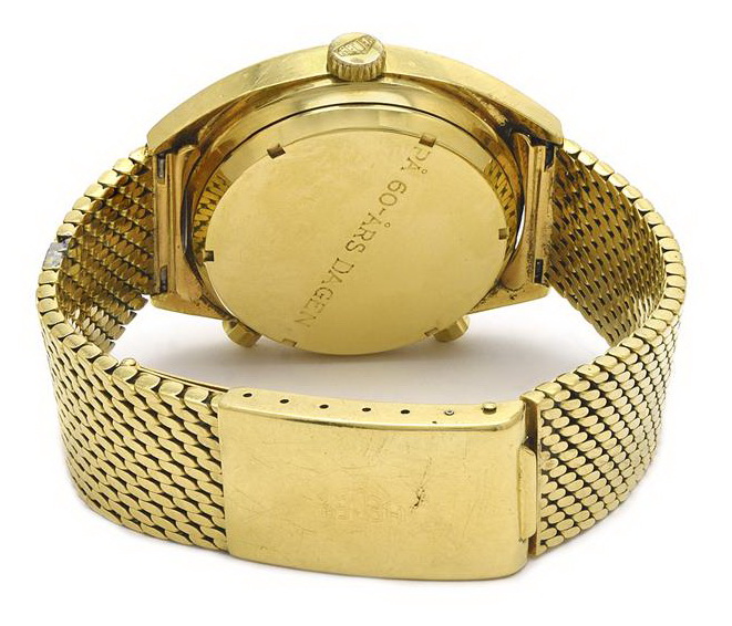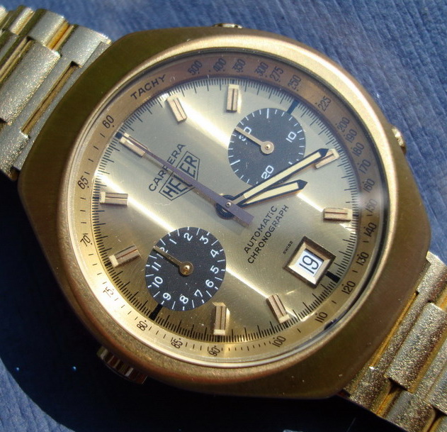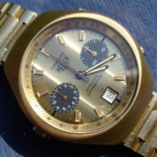 Over the period 1969 through 1979, there were seven versions of the Reference 1158 Carrera (as shown HERE). All models used the same 18 karat gold case, and offered 12 hour chronograph capacity, with an hour recorder (at nine o’clock) and a minute recorder (at three o’clock). Dials were silver (white) or champagne; registers either matched the dial or were black; and the watch was offered on either a Corfam strap (imitation leather) or an intricately constructed Milanese mesh bracelet. This Carrera was always the most expensive watch in the Heuer catalog, typically costing six to eight times as much as a standard Carrera or Autavia. At periods during the 1970s, the bracelet alone cost twice as much as the Carrera itself, so the shopper had a choice of one 18 karat gold Carrera on its special bracelet or a box filled with 12 to 15 of the ordinary stainless steel models. TAG Heuer reports that it sold a total of approximately 500 of these 18 karat gold Carreras over this period.