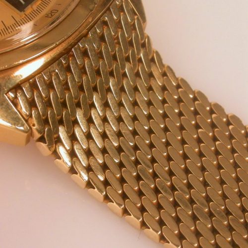 Whatever the peculiarities of the dial may be, one feature of the Ronnie Peterson’s Carrera is especially notable – the 18 karat gold “Maglia Milanese” (Milnese mesh) bracelet. While the case of a Reference 1158 Carrera contains approximately 48 grams of gold, the bracelet is made of 73 grams of gold. Consider the intricate construction of the bracelet, with its hundreds of tiny links, and we see why the bracelet itself cost over twice as much as the watch, in the mid-1970s. These Milanese mesh bracelets are exceedingly rare, with an average of only one or two seen on the market in a given year.