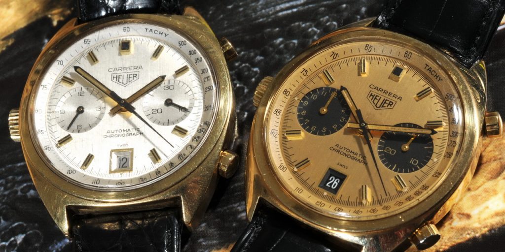 The entire line-up of new chronographs used stainless steel cases, with one exception — an 18 karat gold version of the Carrera (Reference 1158). This watch was the successor of 18 karat gold Carreras that Heuer had offered throughout the 1960s. Later in the 1970s, Heuer would offer the automatic movement in a gold-plated Carrera.