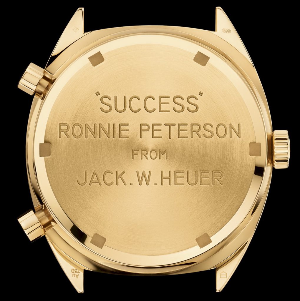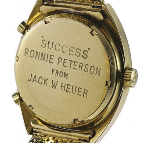 Jack Heuer had the Carrera engraved, “Success / Ronnie Peterson from Jack Heuer”. Jack Heuer has confirmed that the “Success” referenced in the engraving did not refer to any specific race, event or undertaking between Peterson and Heuer, but was a general expression of Heuer’s good wishes for Peterson’s racing career.
