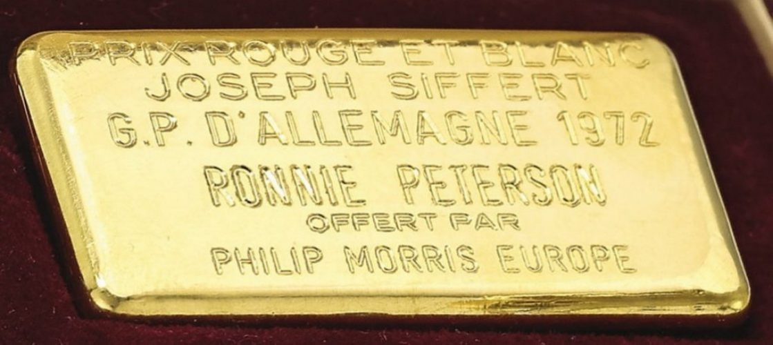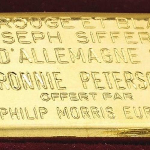 Accompanying the 18 karat gold Carrera in the sale was a 100 gram gold bar from Société de Banque Suisse, awarded to Peterson as the “Prix Rouge et Blanc Joseph Siffert”. In the early 1970s, journalists at each Grand Prix voted on the most impressive driver, and Ronnie Peterson had been the recipient of this award for his performance at the Germany Grand Prix in 1972. Peterson finished third in this race, as Jacky Ickx won the pole, led every lap, and won the race.