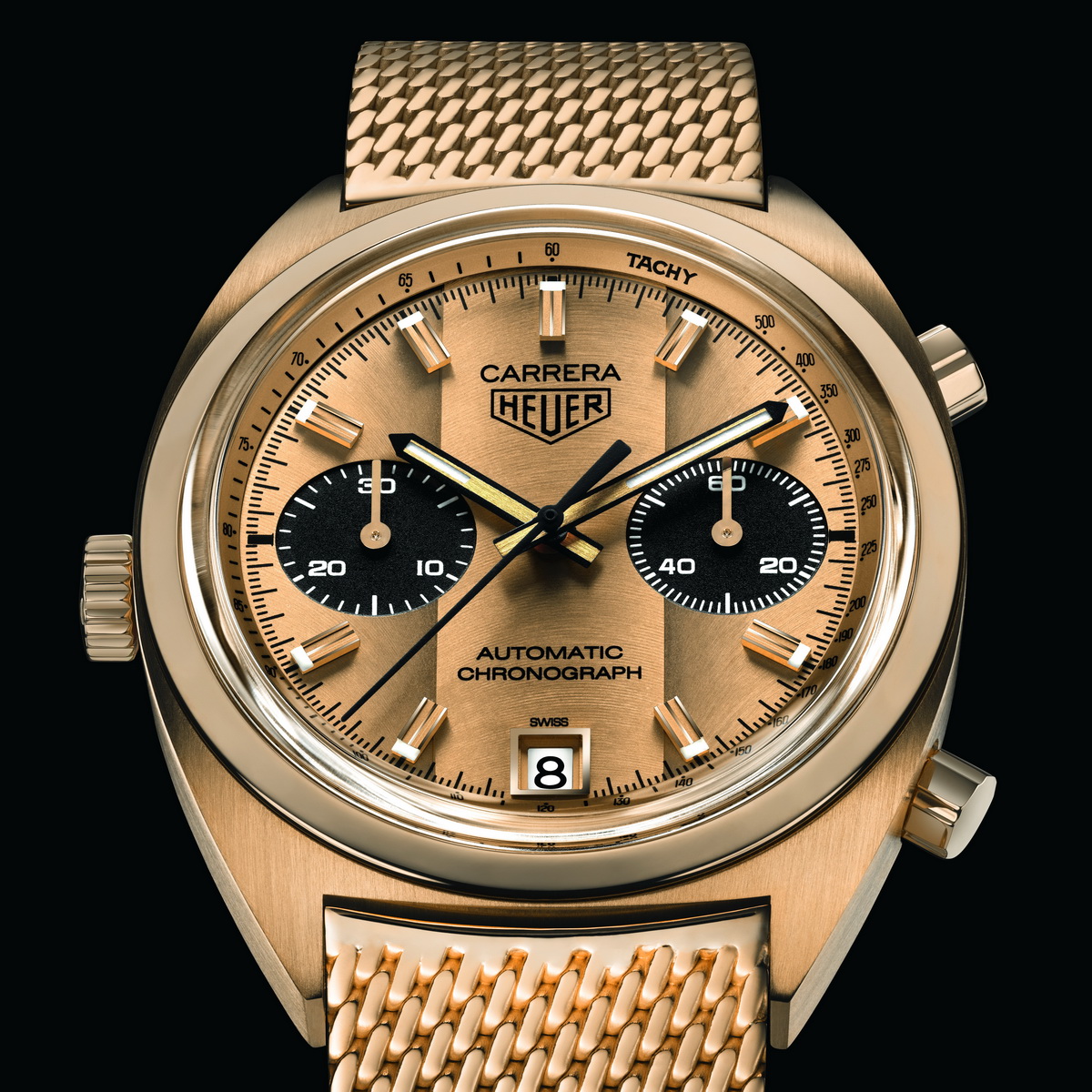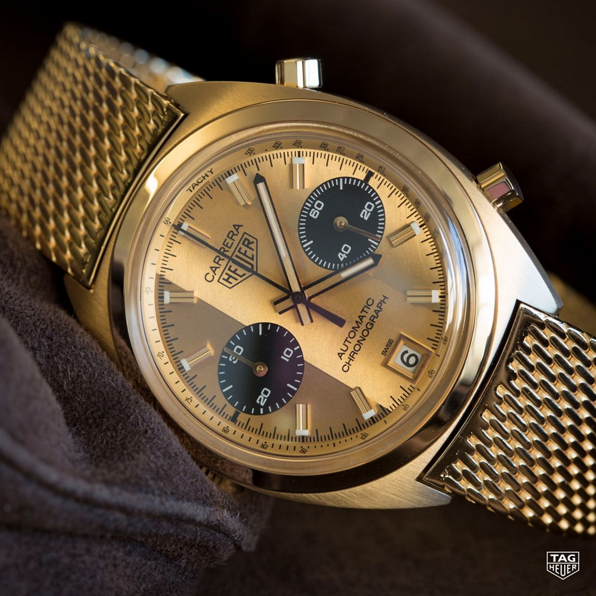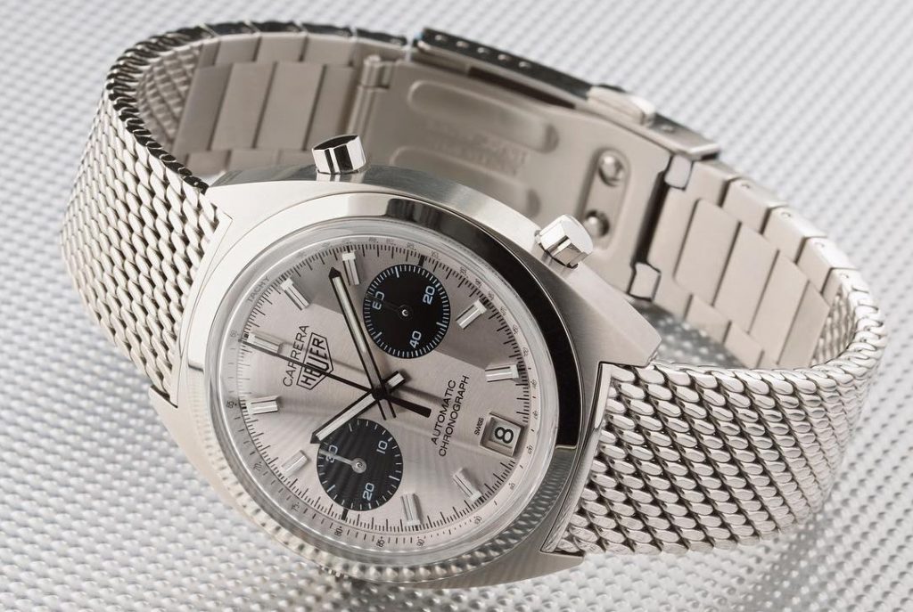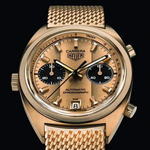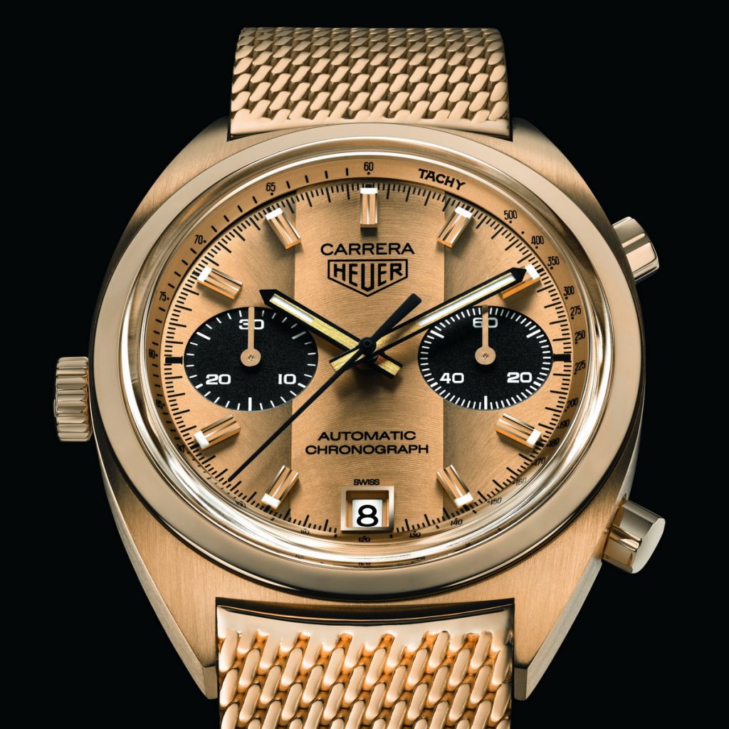 The new Carrera not only mimics the construction of the original watch, but it has the same engraving on the case-back – “Success” Ronnie Peterson from Jack W. Heuer. The bracelet of the tribute watch is also 18 karat gold, with the same Milanese mesh construction as on the bracelets from the 1970s.