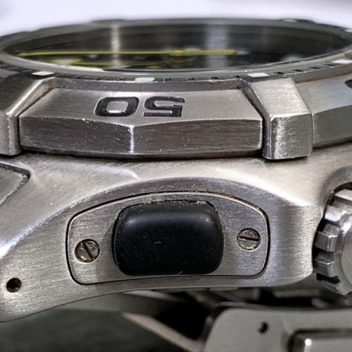 Aquagraph 2000, Reference CN211A, was introduced by TAG Heuer in 2003 and was produced until around 2009. (At some point in its life, the “2000” was dropped from the name, so that it was simply called the “Aquagraph”, but I will use the names interchangeably in this posting.) The brushed stainless steel case measures approximately 44.5 millimeters across the dial, or approximately 41 millimeters if measured vertically (from the top of the case to the bottom of the case). Thickness is 16.2 millimeters, with the lug-to-lug measurement coming in at 50 millimeters; it’s 22 millimeters between the lugs.