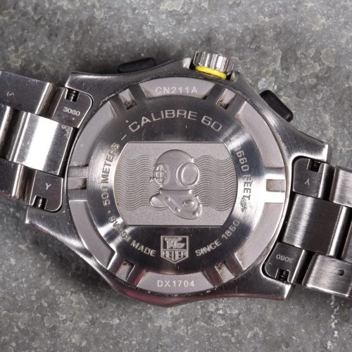 The movement is the ETA 2892-2, with a Dubois-Depraz chronograph module attached. TAG Heuer gave this movement the name “Calibre 60”, although it would not be used in any other watches.