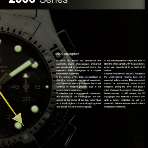 The Aquagraph was first shown in the 2004 TAG Heuer catalog. The catalog states that the Aquagraph 2000 is the first automatic chronograph to use a center-mounted chronograph minutes hand. (While this claim is not correct, as Heuer and several other brands had used the Lemania 5100 decades earlier, it does highlight what may be the most important feature of the watch.) Other features mentioned in the catalog include the screw-down crown, with an indicator to alert the user when the crown has not been screwed down, and an automatic helium release valve (on the left side of the case). The Aquagraph was produced through 2009, and did not have a specific replacement in the TAG Heuer product line. Comparable chronographs in recent TAG Heuer catalogs would include the Aquaracer chronographs with the 500 meter depth rating.