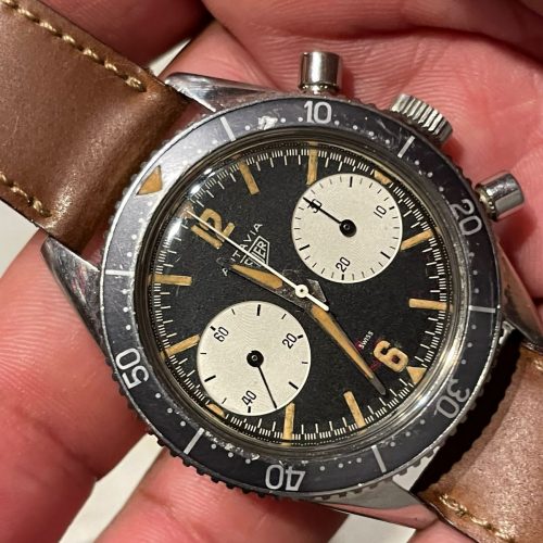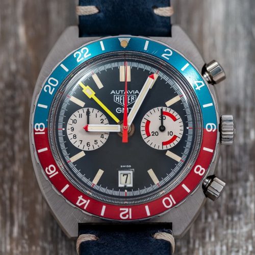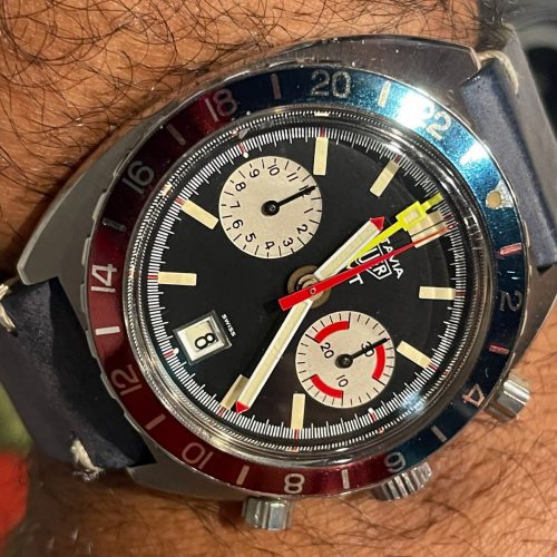 The Autavias in attendance were few in number, but showed how interesting these models can be.  We had an early two-register model (Big Subs, with metal-edged hands) along with a manual-wind GMT, from the early 1970s.