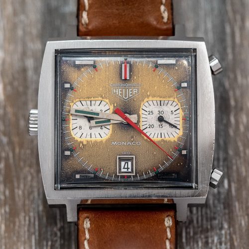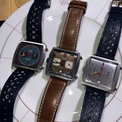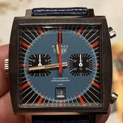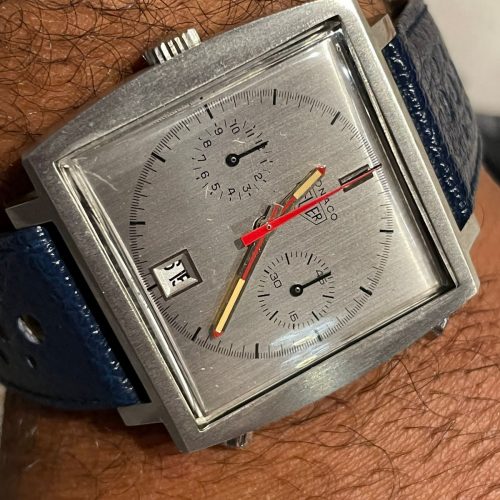 There was nothing ordinary about the Monaco chronographs attending the dinner, with nary a “Steve McQueen” version in sight.  But when it came to the rare Monacos, there were some nice ones to see.  Morgan brought two prototype / test models, one with the crazy blue dial and one in silver gray.  I had seen these watches on social media many time, but seeing them in the metal was fantastic.  I brought my “Paintless Wonder”, an early Chronomatic Monaco on which the midnight blue paint has disappeared, leaving only a clear coating on the brass dial.