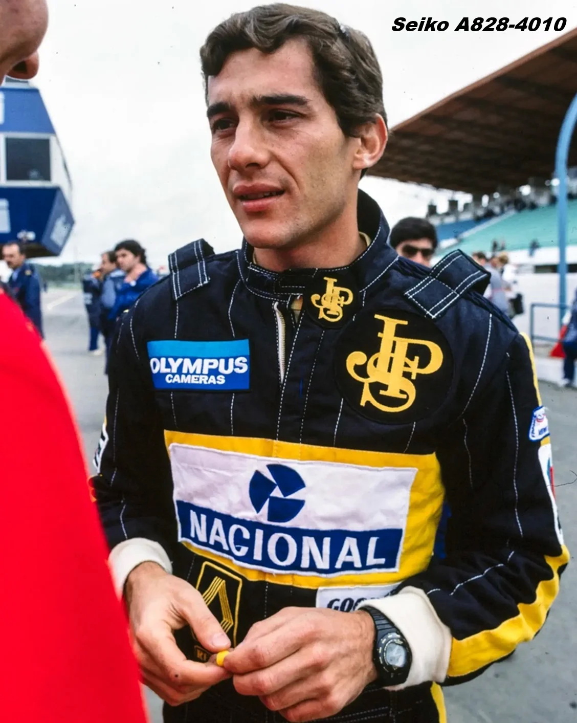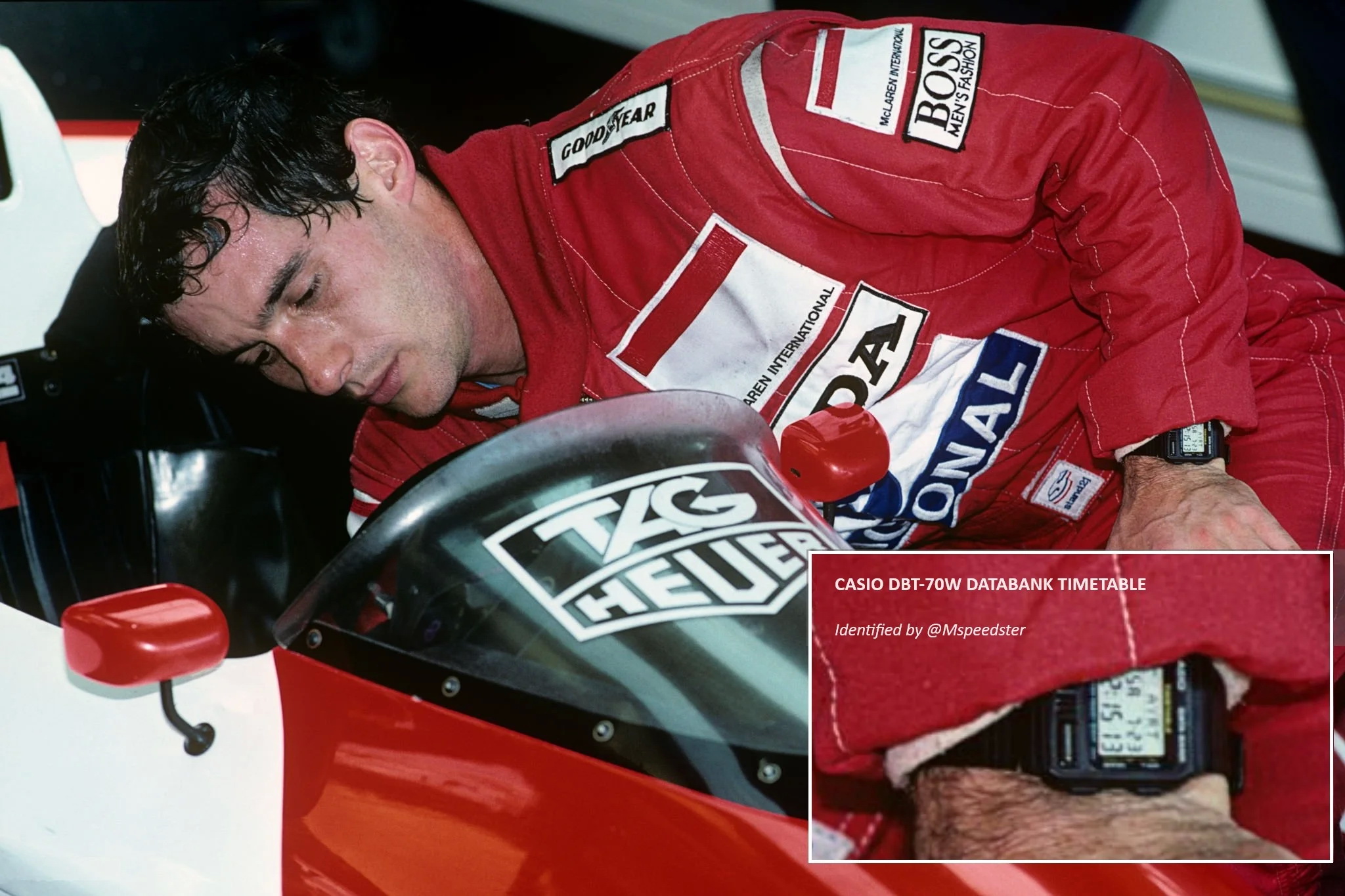 Ayrton Senna was very much a “tool watch” kind of guy, favoring practical functionality over flashy designs or luxury prestige. He usually wore the same watch at home, at work (racing) and at play. Prior to Formula 1, during his Formula Ford and Formula 3 seasons, Senna was mostly seen wearing LCD digital watches, typically a Casio. In his 1984 F1 rookie season with Toleman, Senna wore a Casio TS-1000, distinguishable by the white thermometer dot.