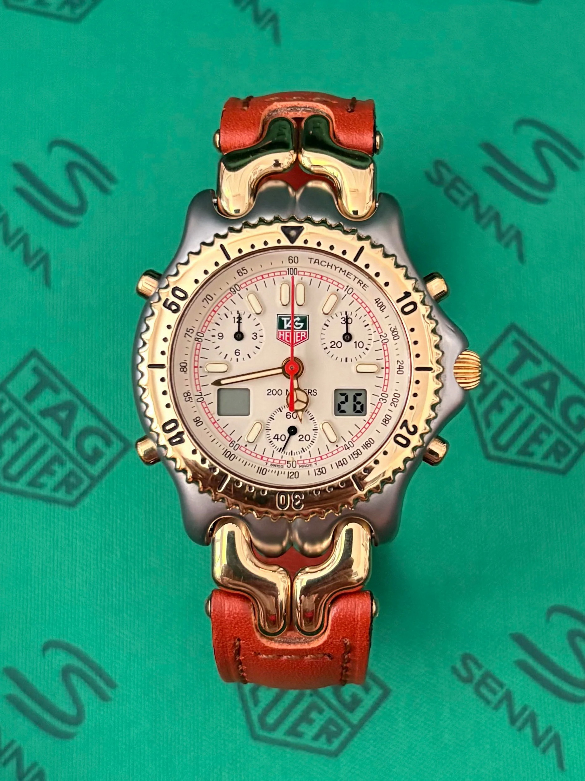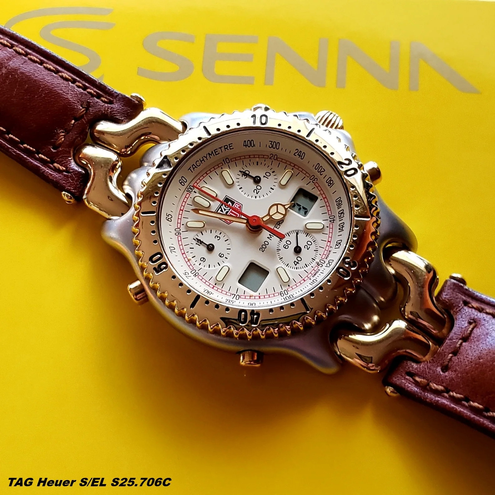 The Formula 1 watch, released in ‘86, was the first new watch to wear the TAG Heuer logo, but its development by Heuer was already underway prior to TAG’s acquisition. TAG Heuer would next introduce the Sports Elegance (S/el) line in 1987, the first fully in-house developed watch since becoming TAG Heuer. The S/el Chronographs were then introduced sometime in ‘89, appearing in the 1990 TAG Heuer catalog. It was the S/el that would become synonymous with Senna. So much so that today TAG Heuer even refers to its unique shaped links as “Senna S links”.