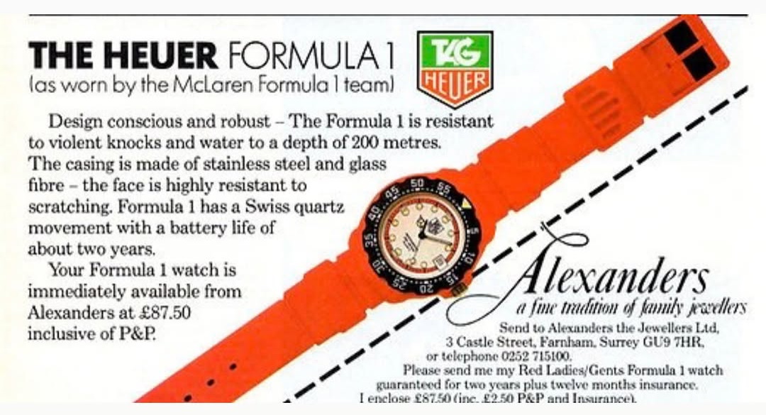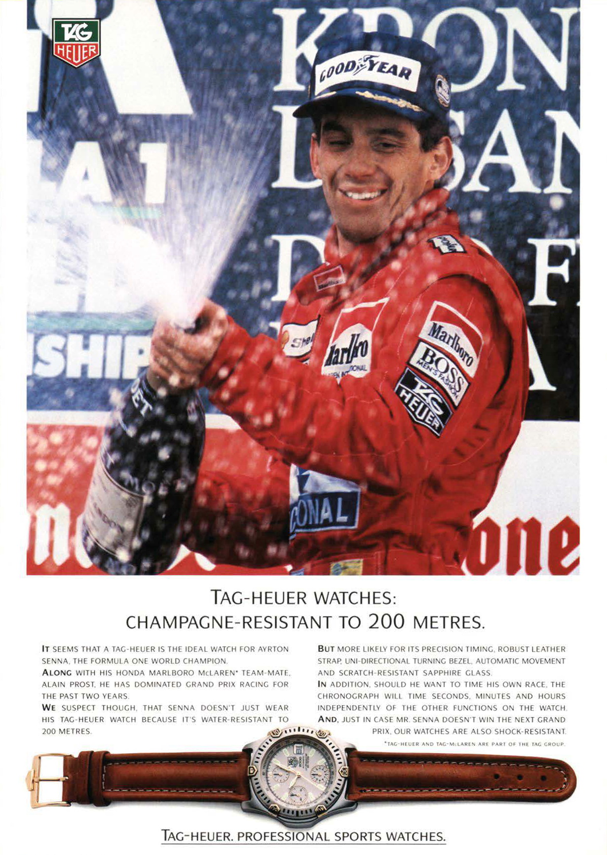 Senna needs no introduction, his name says it all. His heroic drives, character and personal life have been covered elsewhere many times. Here we focus on the watches he wore during his F1 career and what they might have meant to him. Much like his blue Nacional cap, his TAG Heuer watches were an integral part of his persona. Yes, it was a business relationship, but Senna genuinely seemed to enjoy his TAG Heuers, constantly wearing them at almost all times. Not only at the F1 circuits, but everywhere! Whether relaxing at home or at play, like flying his radio-controlled model planes, out on his boat or riding his jetski, his TAG Heuer timepieces rarely left his wrist. He also seemed to take great pleasure in gifting new TAG Heuer watches to friends and family. Senna had an authentic bond with the brand, even helping to design a watch that would carry his name, the “6000 Senna”. This strong connection lives on even today, with TAG Heuer adopting Senna’s famous catch phrase “Designed to Win” as its latest advertising campaign.