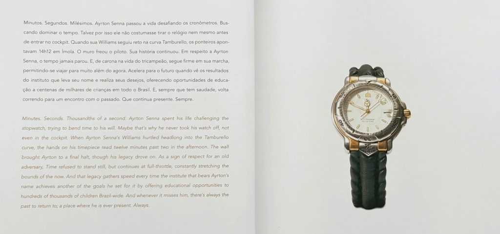 Conclusive evidence is found in the book “100 Senna” by Celso De Campos Jr. The book shares photographs of one hundred real items personally owned by Ayrton and kept by the Senna family. Pictured in the book (below) is item no. 100, Senna’s personal TAG Heuer 6000 Series reference WH1151 on a black leather strap.