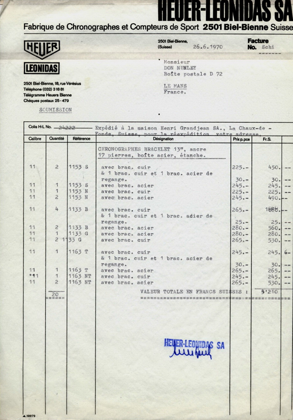 In an article published by the Wall Street Journal in 2016, veteran writer Michael Clerizo meticulously traced the ownership history of the six blue Monaco chronographs that Jack Heuer had delivered to the filming of Le Mans, in June 1970. Steve McQueen would wear these watches during the filming of Le Mans, and the invoice also included a broad range of other Heuer chronographs and timepieces that would be used in the filming.