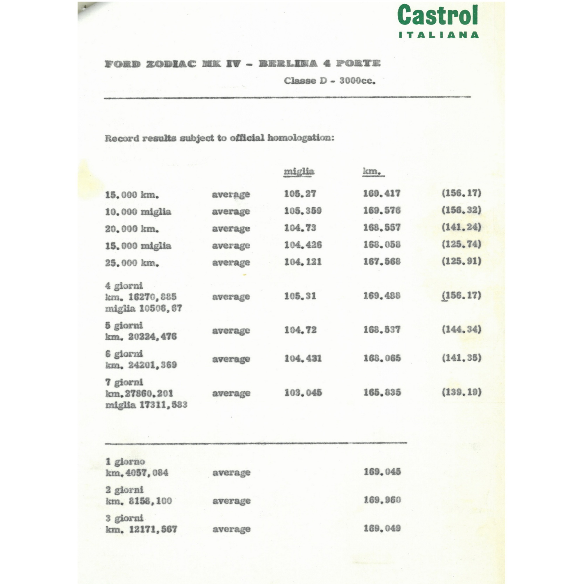 In 1966, Ford introduced their new executive saloon, the Zodiac model, with the new Essex 3-liter V6 engine. To prove the capabilities of the new model, Ford staged a seven-day endurance test at Monza, with a team of five drivers covering 6,658 laps of the circuit (17,312 miles), averaging 103.04 miles per hour, for this run. The new car set an additional eight class records over the test, including highest average speed over 10,000 miles and highest speeds over four, five and six days.