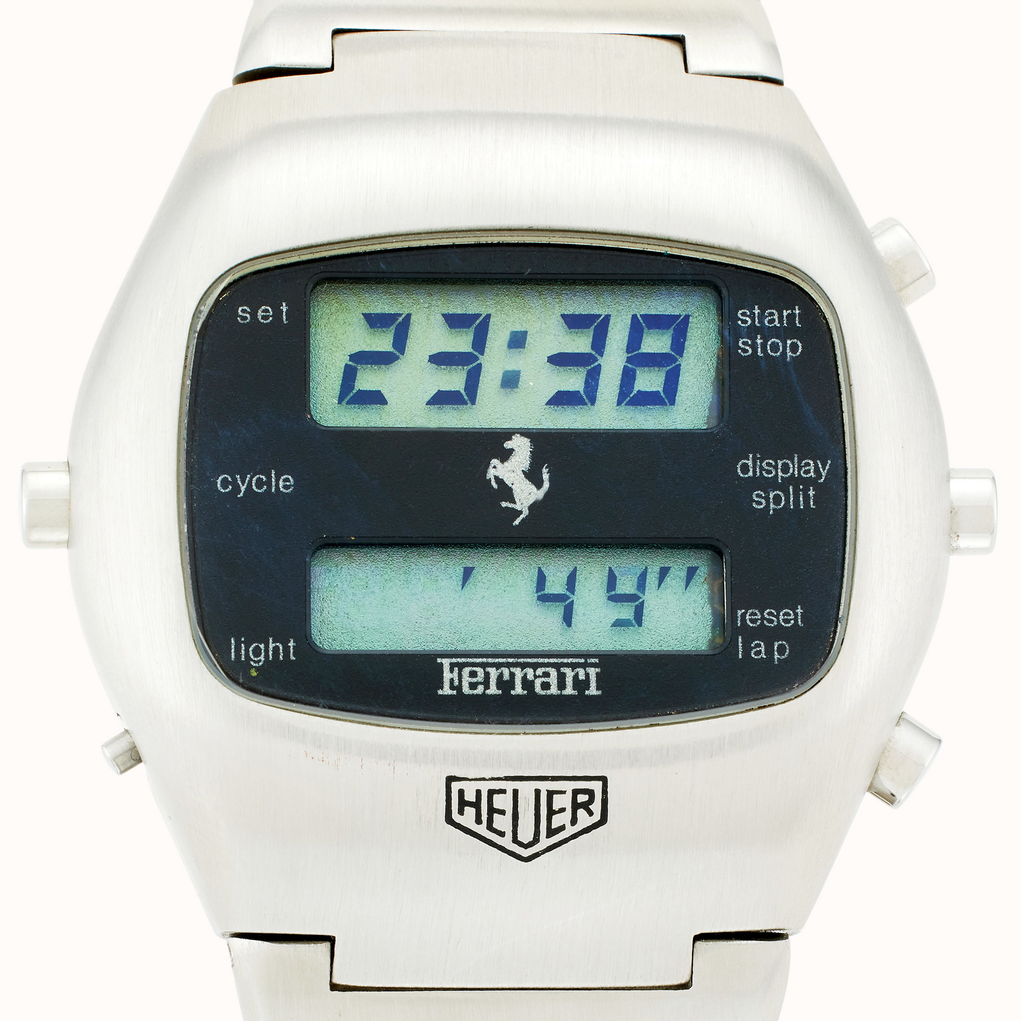 Heuer introduced its first electronic chronograph in 1976, with the very futuristic Chronosplit incorporating two digital displays. This was the time when the Heuer-Ferrari partnership was at its peak, with Heuer providing timing equipment for the team, the Ferrari drivers wearing 18 karat gold Carreras and the bright red cars carrying the Heuer shield.