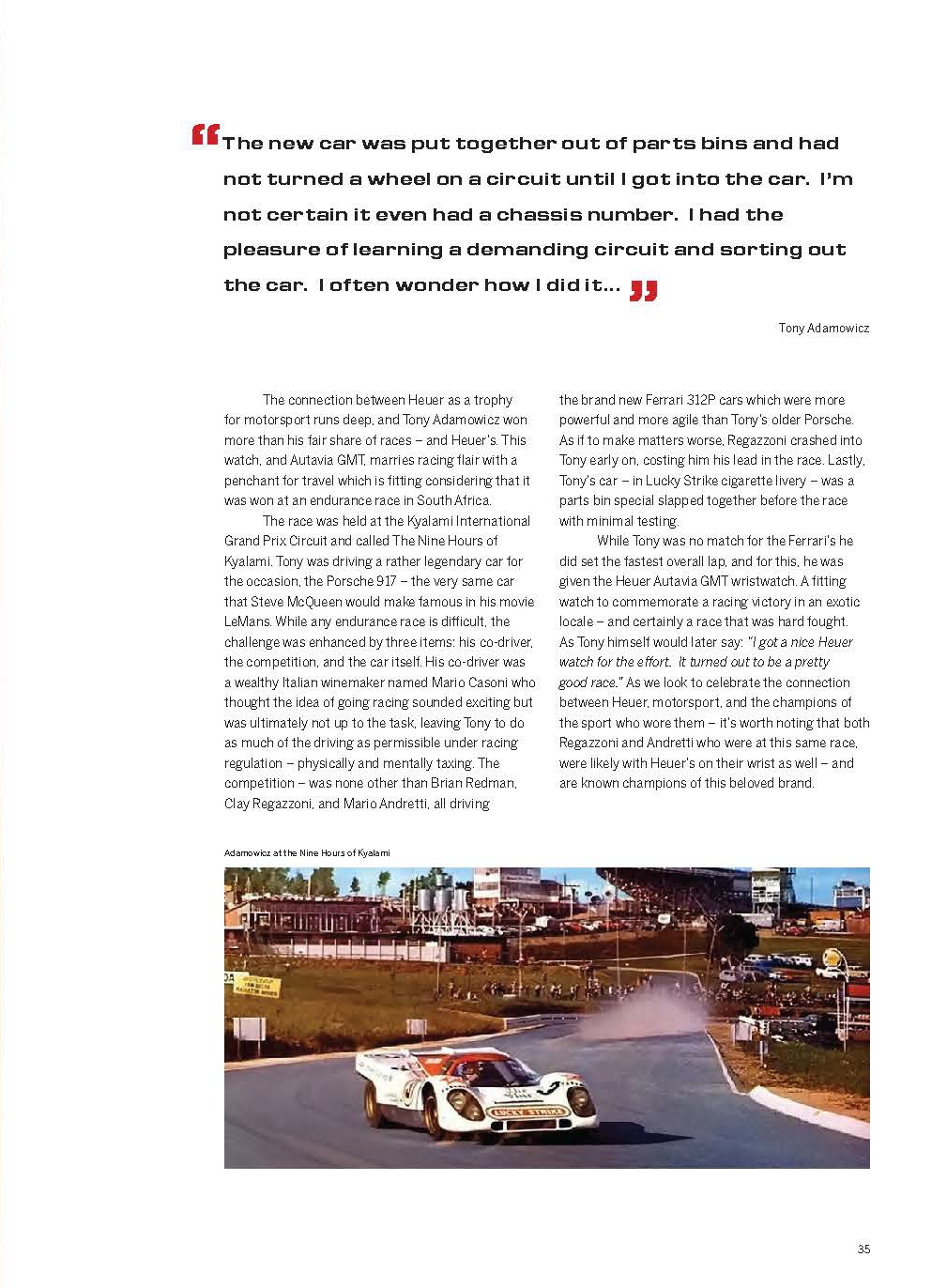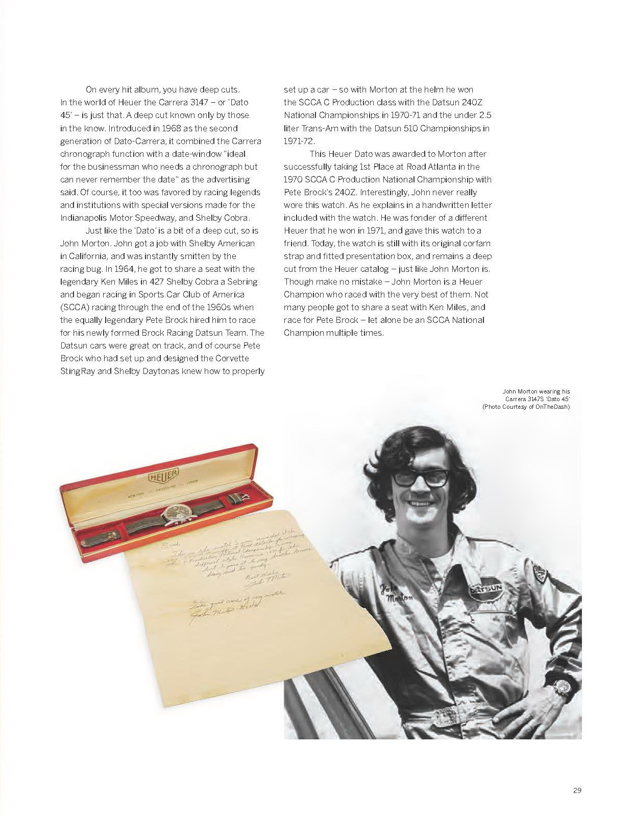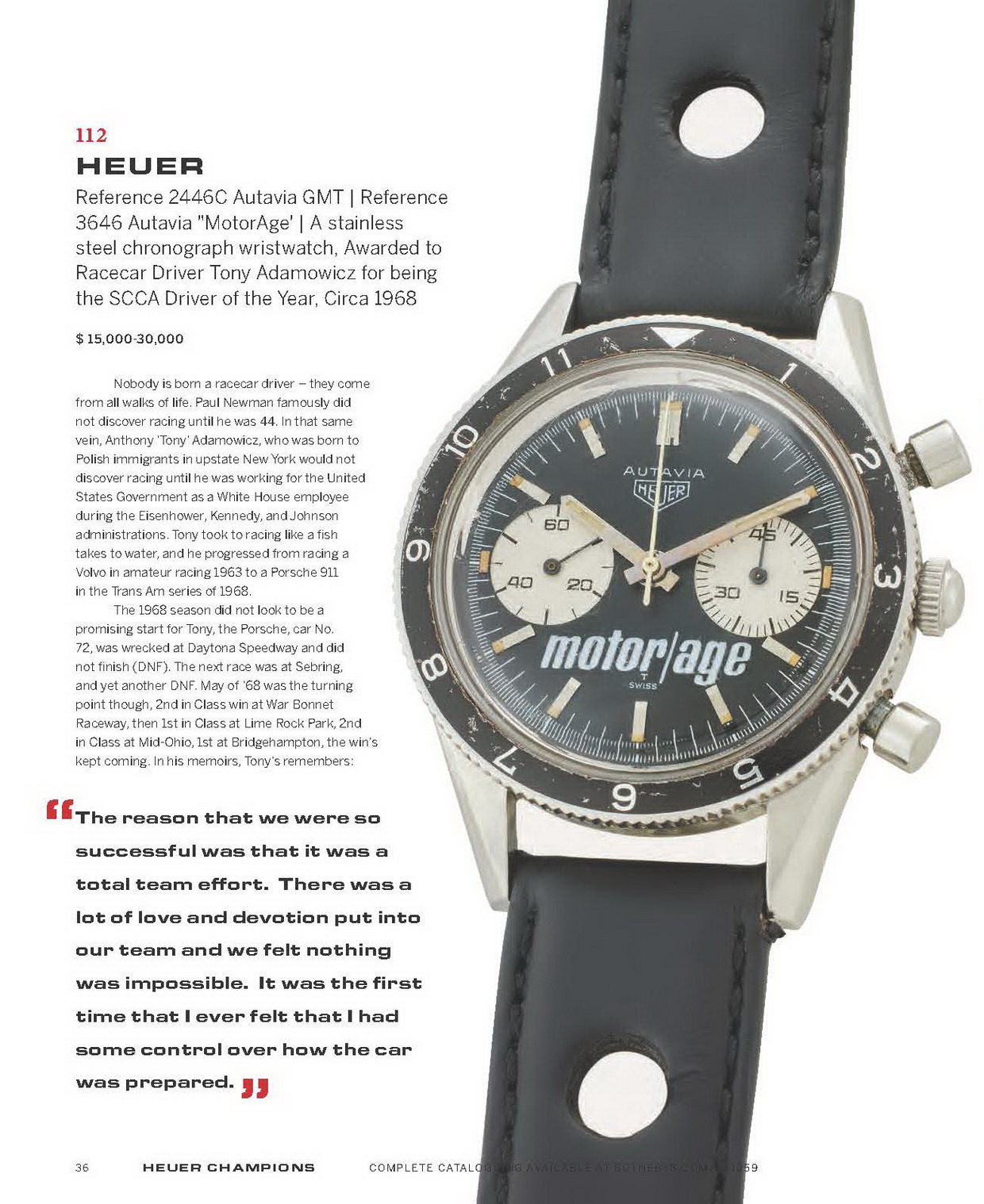 For the 1970 SCCA Runoffs, each class winner received a Heuer chronograph, with Morton winning the Carrera 45 Dato chronograph (reference 3147N) that is included in the Heuer Champions auction as Lot 108.
