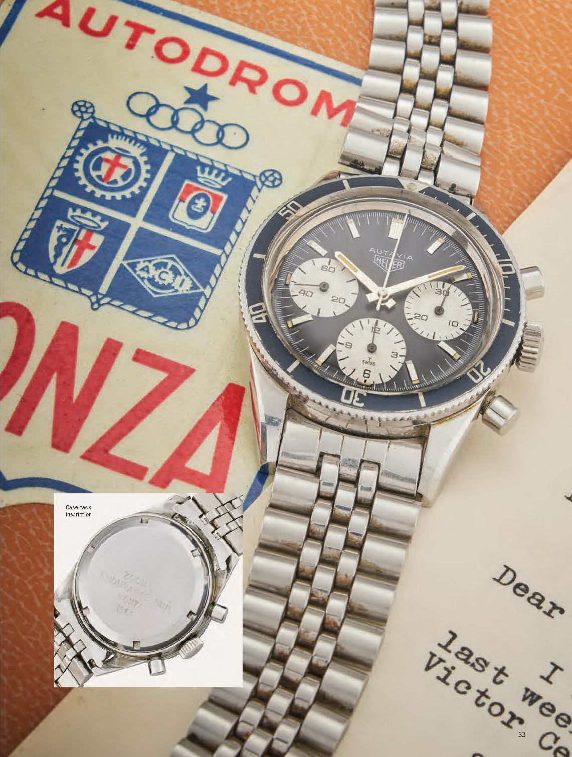 To celebrate the back-to-back championships in 1970 and 1971, the Vel’s Parnelli Jones team ordered a batch of Heuer Autavias (reference 1163), with the case-backs engraved to commemorate the championship seasons. The Vel’s Parnelli Jones Autavia being sold as Lot 119 in the Heuer Champions auction comes together with a coat that was issued to the VPJ team member who had received the watch.