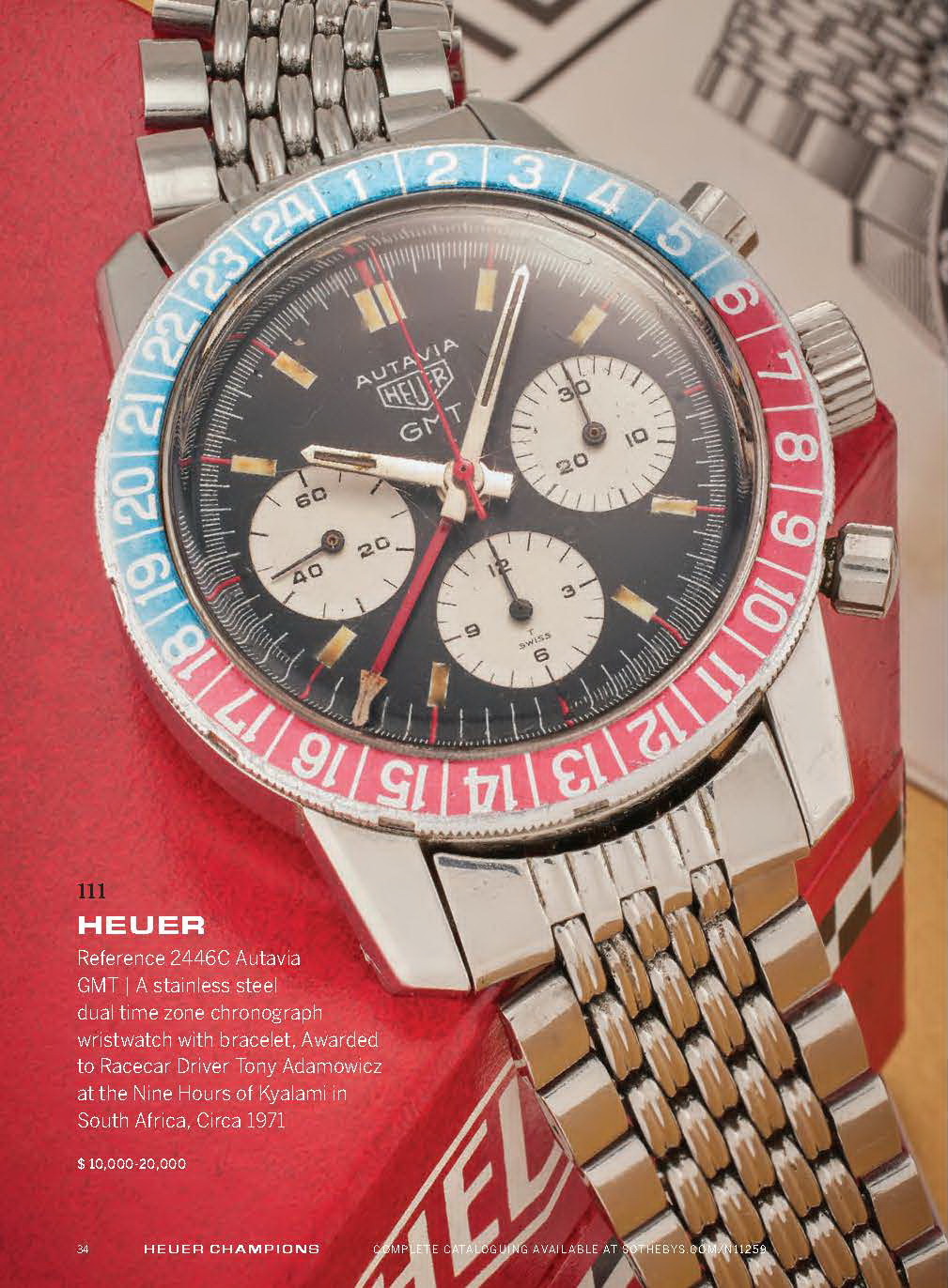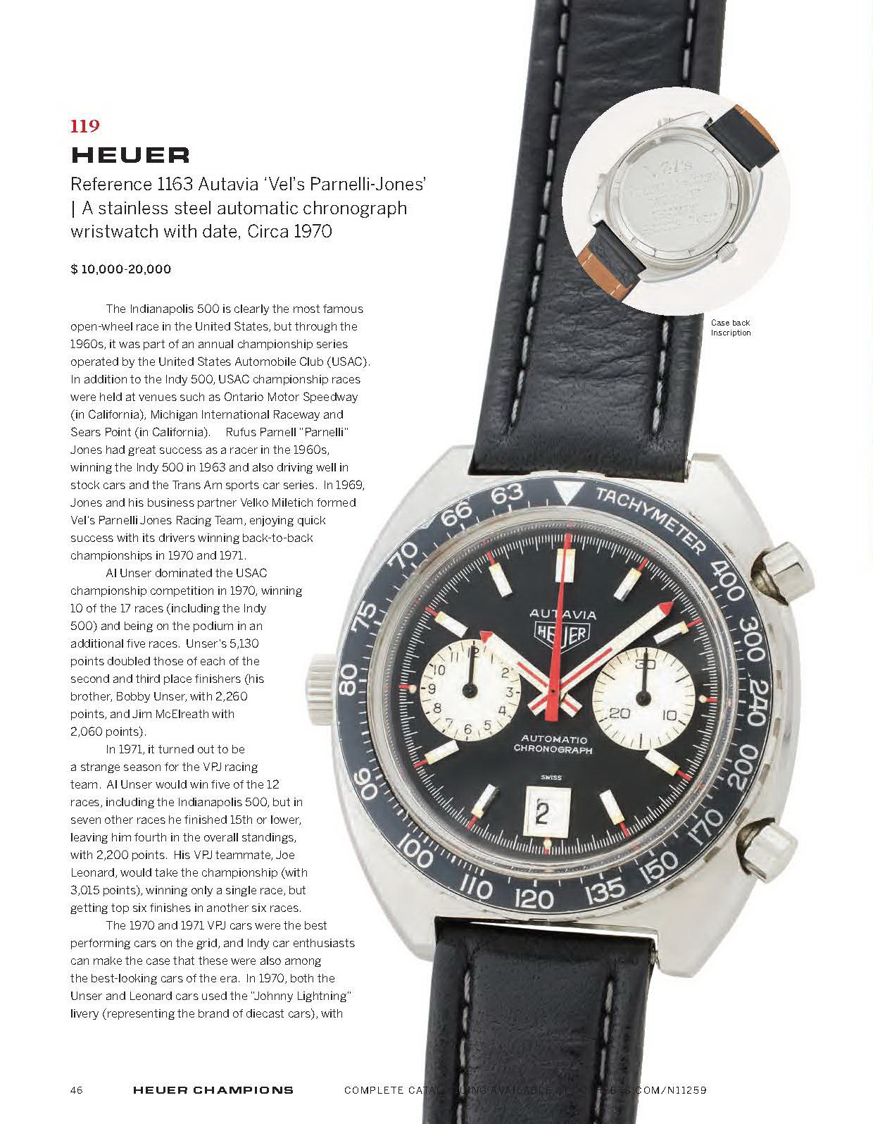 I have consigned seven lots to Sotheby’s for inclusion in the Heuer Champions auction, as follows: Lot 93 (two split-second stopwatches, in red cases); Lot 100 (Abercrombie & Fitch Auto-Graph chronograph); Lot 117 (Autavia reference 1163 GMT Mark 2); Lot 118 (Autavia reference 73633, “Villeneuve” model); Lot 119 (Autavia, reference 1163 “Pre-Viceroy”, engraved to commemorate the 1970 and 1971 championships won by the Vel’s Parnelli Jones Racing Team, with coat from team member); Lot 125 (two Indianapolis Motor Speedway stopwatches, in red rubber holder marked “Champion”); Lot 126 (Timing Board with two dashboard Autavias).