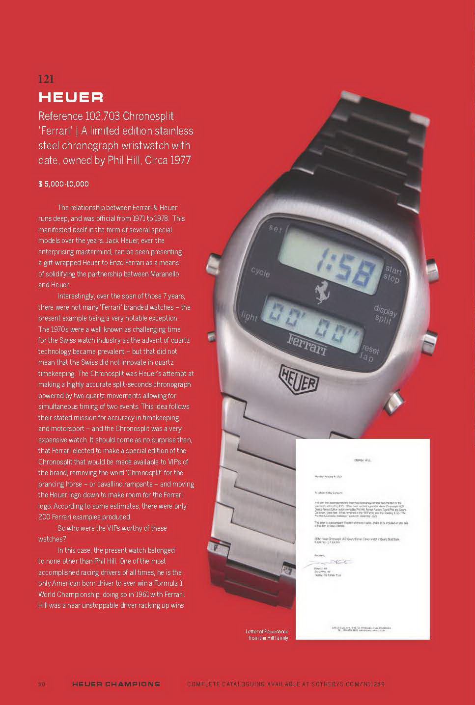 The Ferrari Chronosplit watch received by Hill is included in the Heuer Champions auction as Lot 121.