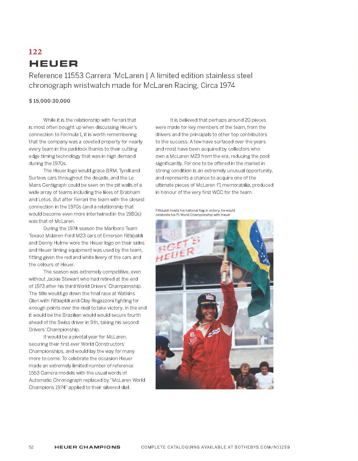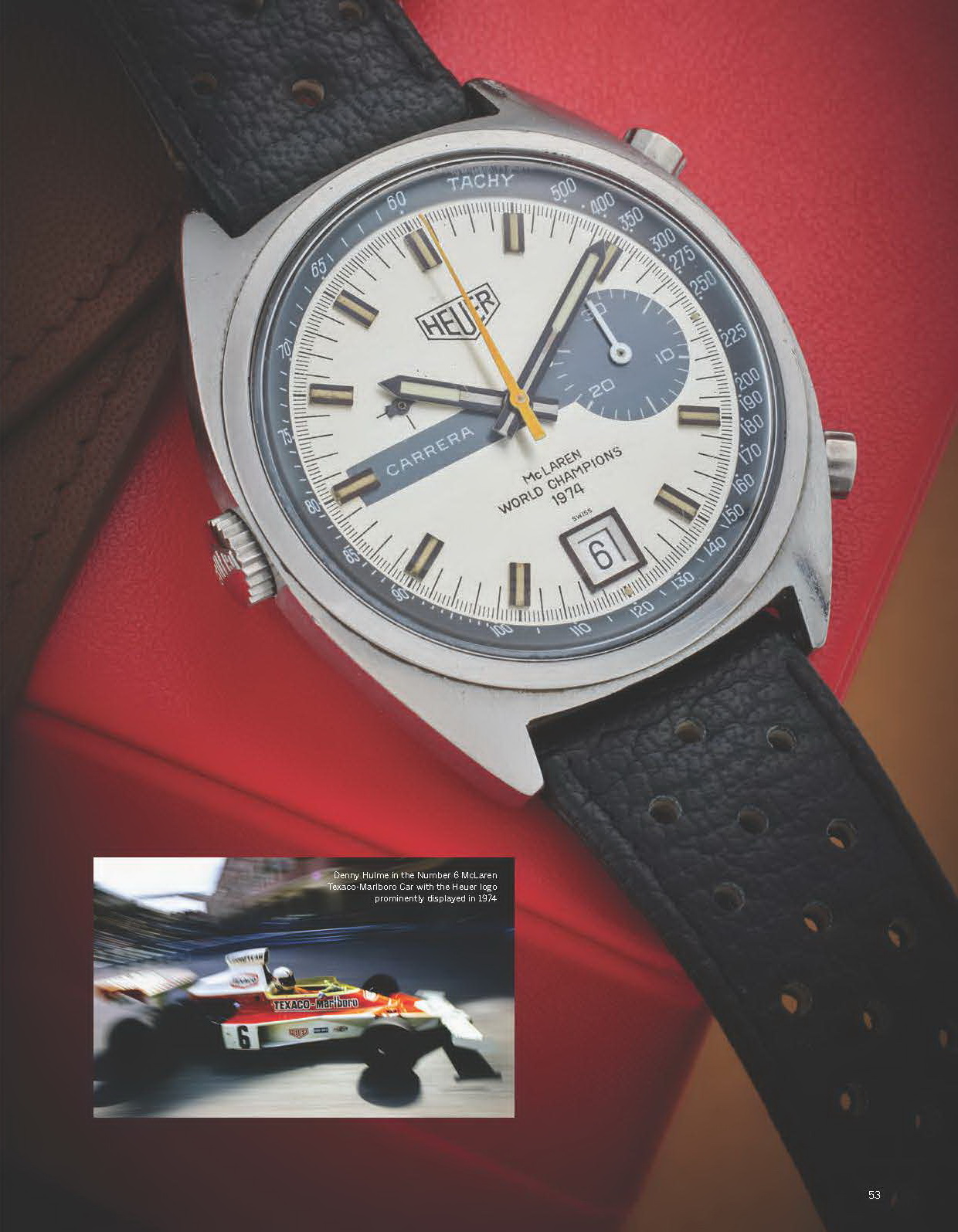 To celebrate the occasion, Heuer produced a special version of its reference 1553 Carrera chronograph, with the usual words “Automatic Chronograph” replaced by “McLaren World Champions 1974” across the bottom of the silvered dial. It is estimated that approximately 20 of these Carrera chronographs were made for key members of the team, including the one offered as Lot 122 in the Heuer Champions auction.