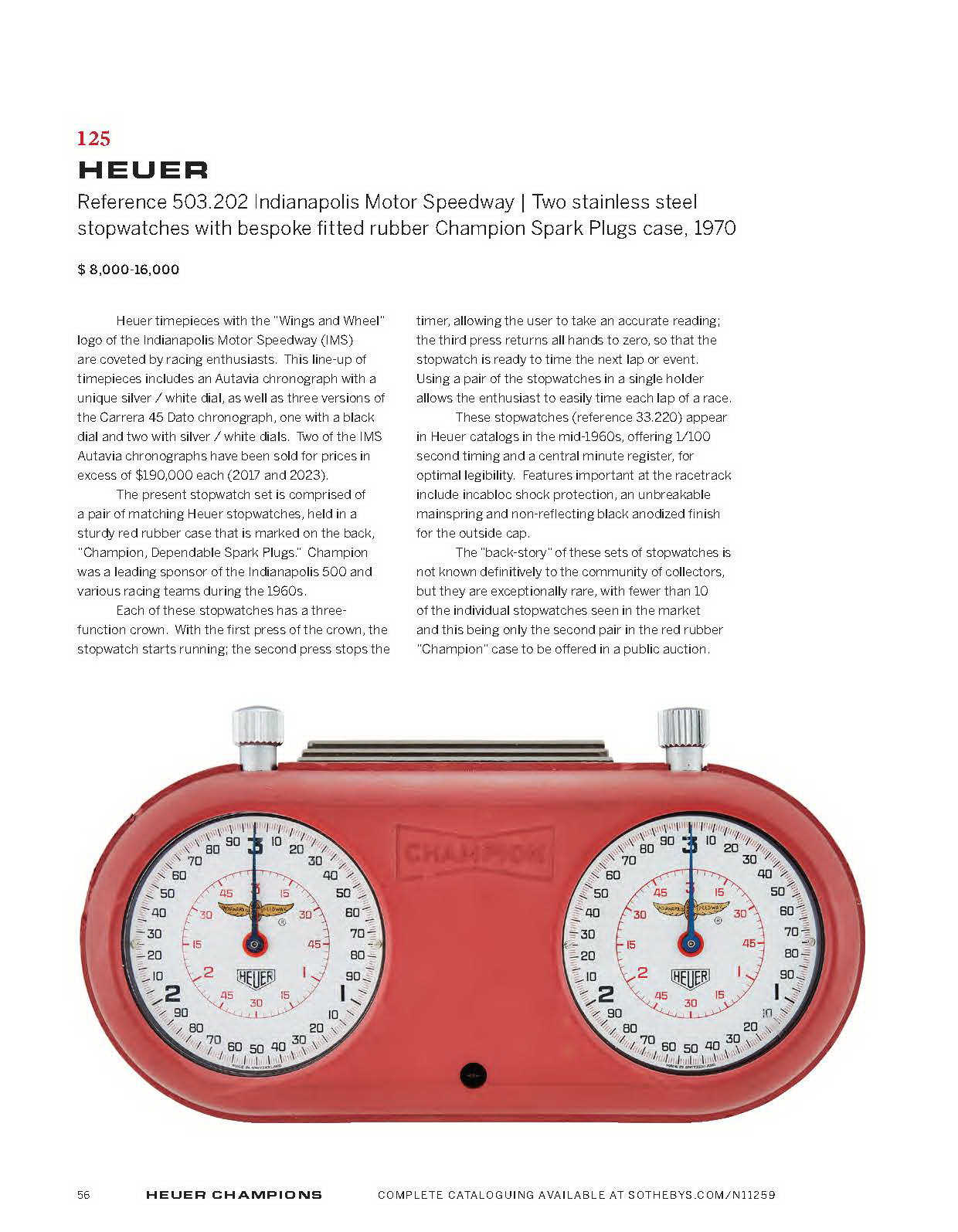 The pair of Heuer stopwatches (reference 503.220) included in the Heuer Champions as Lot 125 has the “Wings and Wheel” logo of the Indianapolis Motor Speedway printed on the dial, with the pair housed in a red rubber case from Indy 500 sponsor, Champion spark plugs.