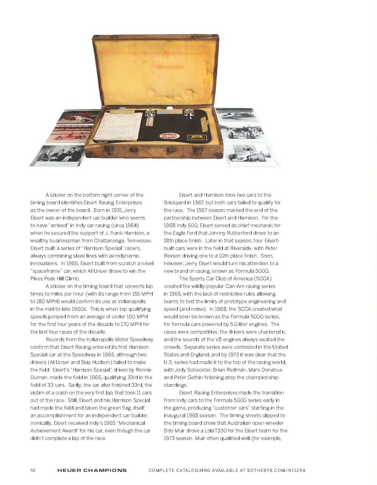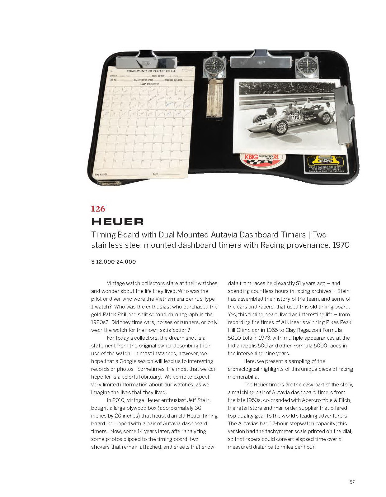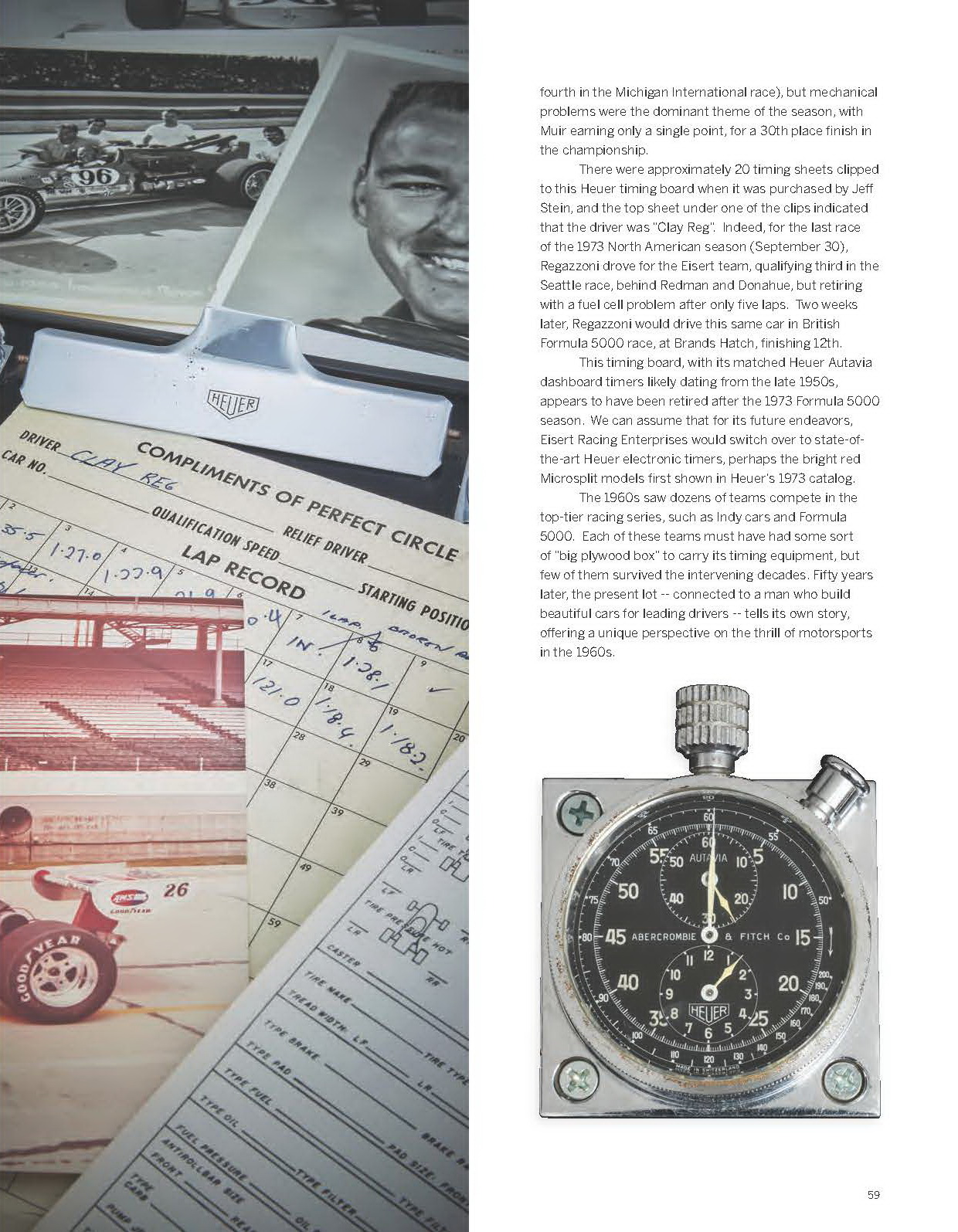 Lot 126 of the Heuer Champions auction is the timing board that was used by the Eisert racing team from the mid-1960s, when the team was active in Indy car racing, through the 1973 Formula 5000 season. Attached to the timing board are two Heuer Autavia 12-hour stopwatches, co-branded “Abercrombie & Fitch”, as well as some photos and timing sheets from the Eisert team racing archives.