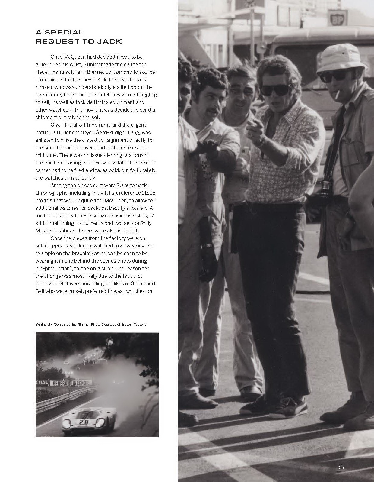 Nunley or his prop team had shopped at local Le Mans area stores to be able to offer McQueen a variety of timepieces that would be suitable for Delaney. That table included watches and chronographs from Heuer, as well as from Bulova, Longines, Omega, Rolex and Tissot. In his first reaction, McQueen picked up one of the day’s most popular watches, an Omega Speedmaster. Nunley suggested that this would not be the ideal choice for two reasons — first, the Omega chronograph would create something of a mismatch, as Delaney’s racing suit would have a very prominent red and white Heuer patch, and second, with the sudden popularity of the Speedmaster after the 1969 moon landing, people watching the film might assume that McQueen was being sponsored by Omega.