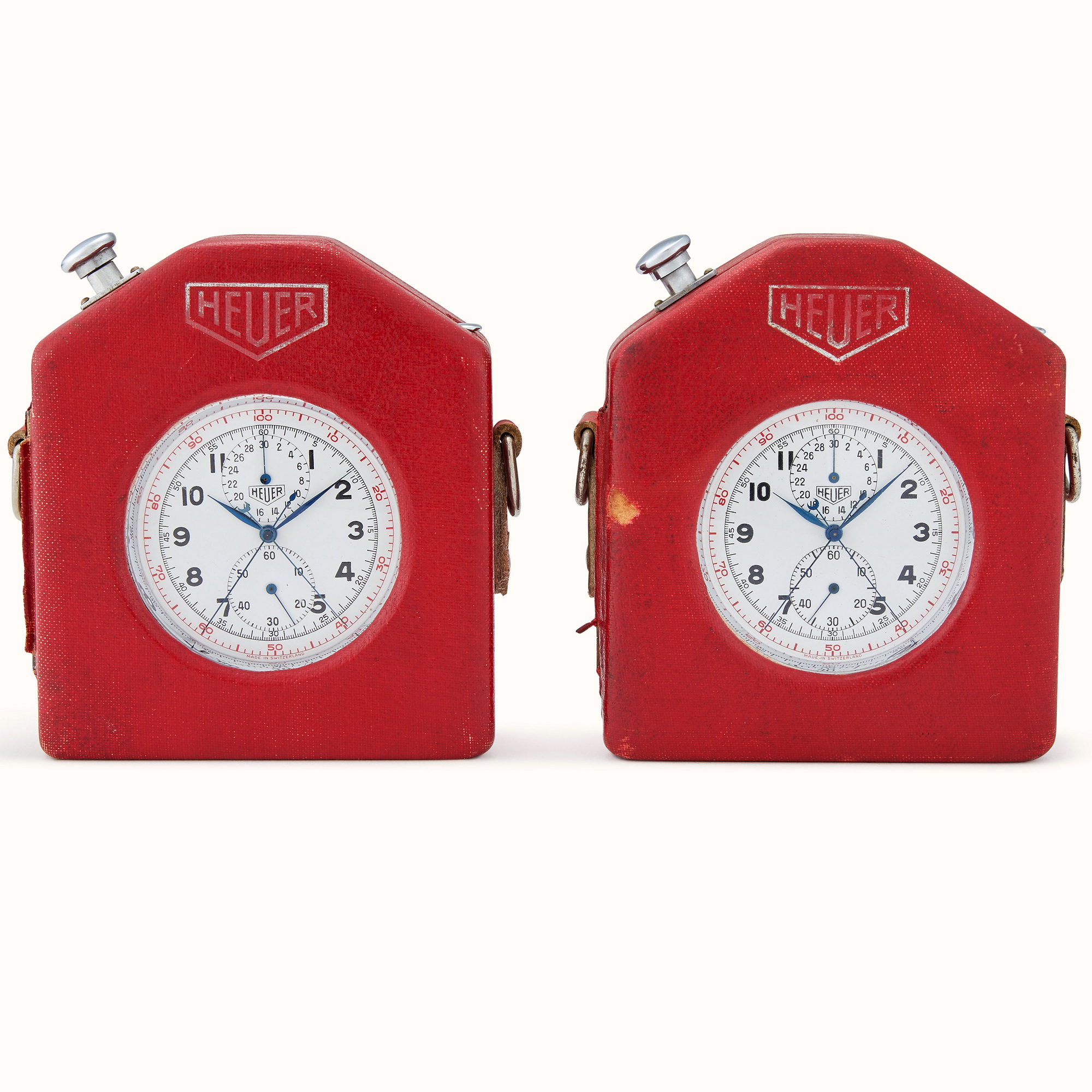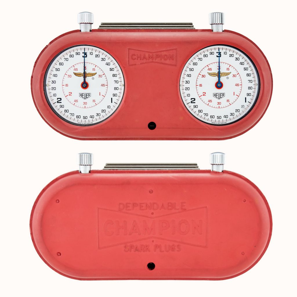 The present stopwatch set is comprised of a pair of matching Heuer stopwatches, held in a sturdy red rubber case that is marked on the back, “Champion, Dependable Spark Plugs.” Champion was a leading sponsor of the Indianapolis 500 and various racing teams during the 1960s.
