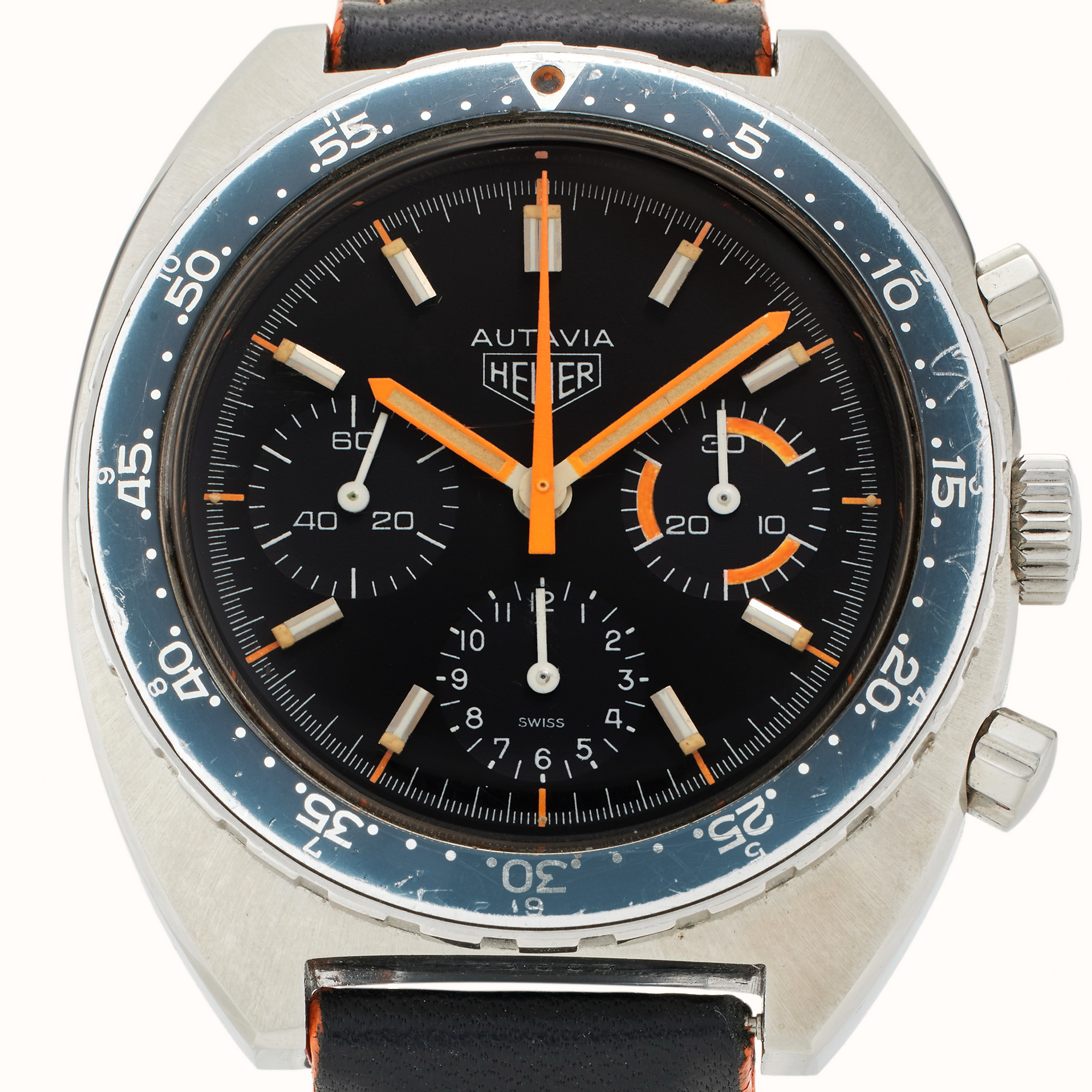 Heuer introduced its Autavia chronograph in 1962, with defining features being an oversized waterproof case, large white recorders on black dials, and a rotating bezel that provided additional timekeeping options. These bezels were marked for either hours, minutes or decimal minutes, allowing the enthusiast to select the chronograph to suit their specific timing needs (hours for world travelers, minutes for divers, etc.)