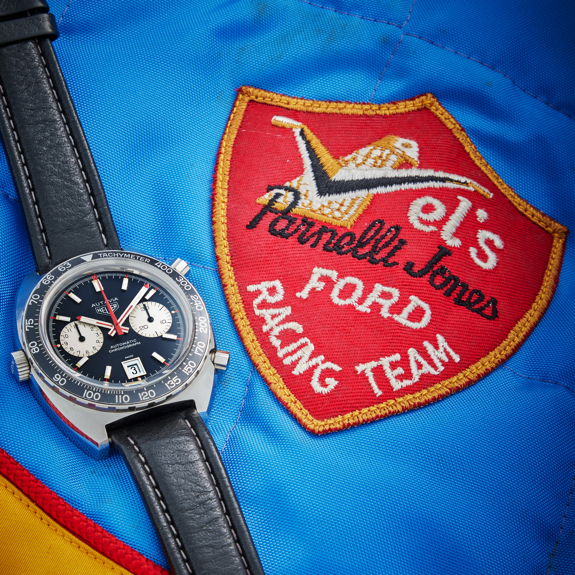 - Lot 119 — Heuer Autavia, Reference 1163 “Pre-Viceroy” model, engraved for Vel’s Parnelli Jones Racing Team 1970 and 1971 Indy Car Championships, with team coat