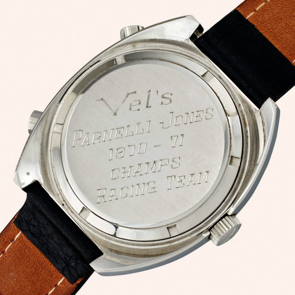 To celebrate the back-to-back USAC championships, Vel’s Parnelli Jones team ordered Heuer Autavia chronographs. A member of the team recalls that they ordered 12 or 15 of the watches, each engraved “Vel’s Parnelli Jones Racing Team, 1970-71 Champs”, a keepsake for team members and VIPs.