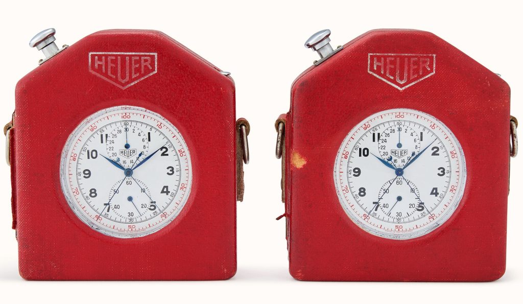 With sports car rallies becoming popular in the 1950s, Heuer designed a new type of leather-covered case for its split-second chronographs. Officials or competitors would set the time, start the chronograph and then place the timepiece into the hinged holder. The split-second hand could be operated by the pusher that extended above the left side of the timepiece, while a pin on the right side locked the case, ensuring that the time-of-day and chronograph could not be changed, whether by accident or in an effort to tamper with the timekeeping.