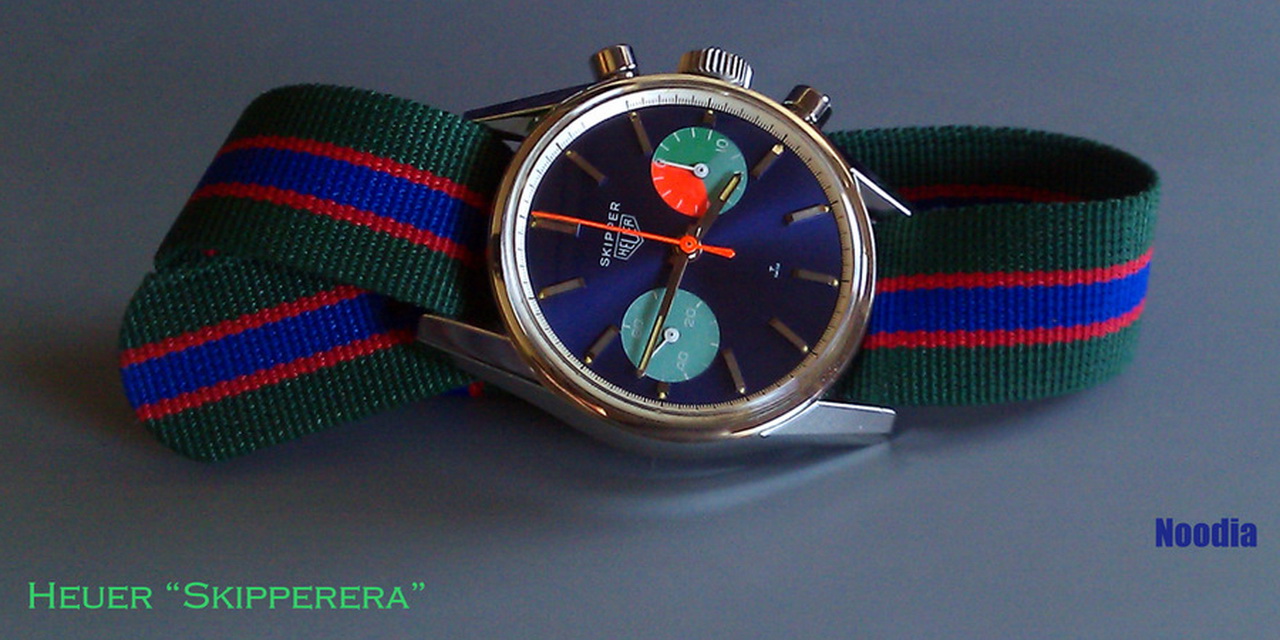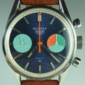 The Skippers bear several similarities to the Seafarers: (a) they are colorful, (b) they are intended to be worn for boating, fishing or other water-related activities, and (c) saddest of all — like the hermit crabs we see at the beach — they never had shells (cases) of their own. You see, the poor Skipper had to find a home in the case of the 1960s Carrera, as well as a progression of Autavias (borrowing from the References 7763, 1563, 11630 and 11063. [Like the hermit crab, that must seek larger shells over the course of its life, the Skipper also moved to increasingly larger cases, as it grew over the years!!]