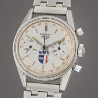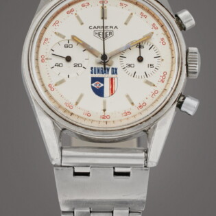 The Carrera being sold by Sotheby’s as Lot 90 in its Fine Watches Auction has the serial number 72620, which suggests that the watch was produced circa 1967. Gary believes that the Sunray DX racing team ordered 12 of these watches and gave them to members and friends of the team.