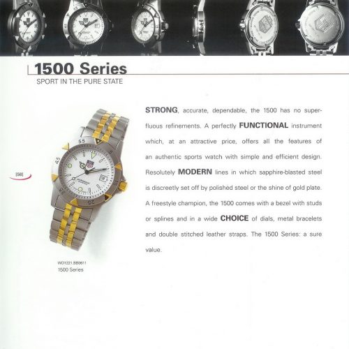 TAG Heuer introduced the Series 1500 watches in 1990, and the watches make their first appearance in the 1991 catalog. The Series 1500 was positioned below the Series 2000, offering “safety and reliability” at an attractive price. The 1997 catalog describes the 1500 as having no superfluous refinements, offering all the features of an authentic sports watch, with simple and efficient design. The watches offer the modern look of the 2000 Series, with cleaner lines (for example, thinner lugs).