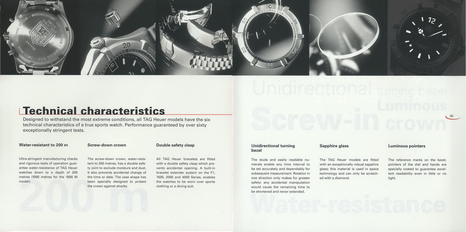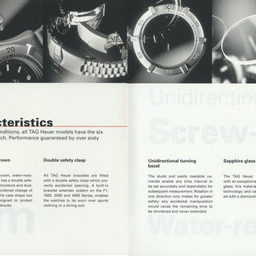 Six Features. In 1995, TAG Heuer began using the phrase “six features” in marketing its dive watches, but Heuer was already incorporating the “six features” into its dive watches as early as 1983. The six features of TAG Heuer’s dive watches over the 1980s and 1990s were as follows: (1) water-resistant to 200 meters, (2) screw-down crown, (3) double safety clasp on the bracelet, (4) unidirectional turning bezel, (5) sapphire crystal, and (6) luminous pointers, for the markers on the dial, the hands and the bezel. Toward the end of the 1990s, TAG Heuer undertook a strategy of moving away from the six features, so that its watches would offer a greater variety of styles; however, certain collections continued to incorporate these features.