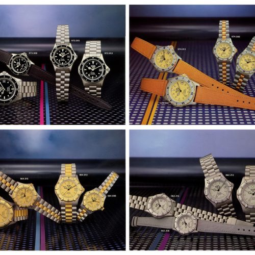 Heuer offered a wide variety of dive watches over the years 1978 through 1983, primarily referenced as the 844.xxx and 980.xxx models, and first used the name “1000 Series” for its standard collection of dive watches in its 1984 catalog. By the time that it was named the “1000 Series”, Heuer’s collection of dive watches consisted of over 40 models. Cases were stainless steel, two-tone (steel and gold or black and gold), coated in black, pewter or green, or gold-plated, and the catalogs pointed out that the quartz movements allowed for flatter cases. The 1000 Series dive watches carried forward key features from the Reference 844 and 980 predecessors, including short, rounded lugs and prominent crown guards.