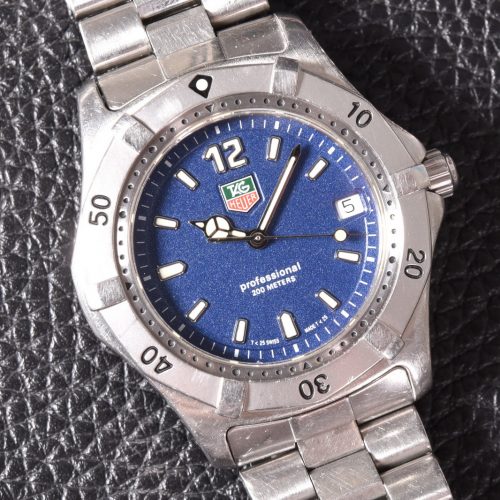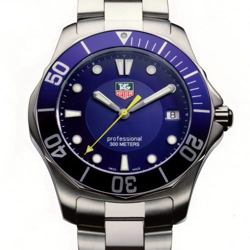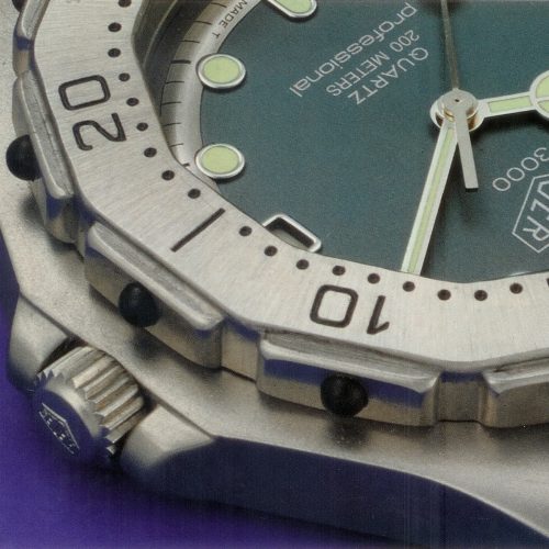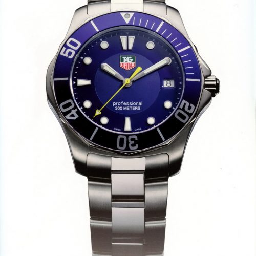On the very first Aquaracer models, dials were marked “Professional”, rather than “Aquaracer”, but catalogs and advertisements referred to the new model as the 2000 Aquaracer. Defining features of the first Aquaracer dive watches were aluminum bezels to match the dial, a yellow second hand so that the diver can easily see that their watch is operating, and waterproofing increased from 200 feet to 300 feet. The first 2000 Aquaracer models met with great success, prompting TAG Heuer to relaunch the full 2000 Series model line as the “Aquaracer” in 2005.
