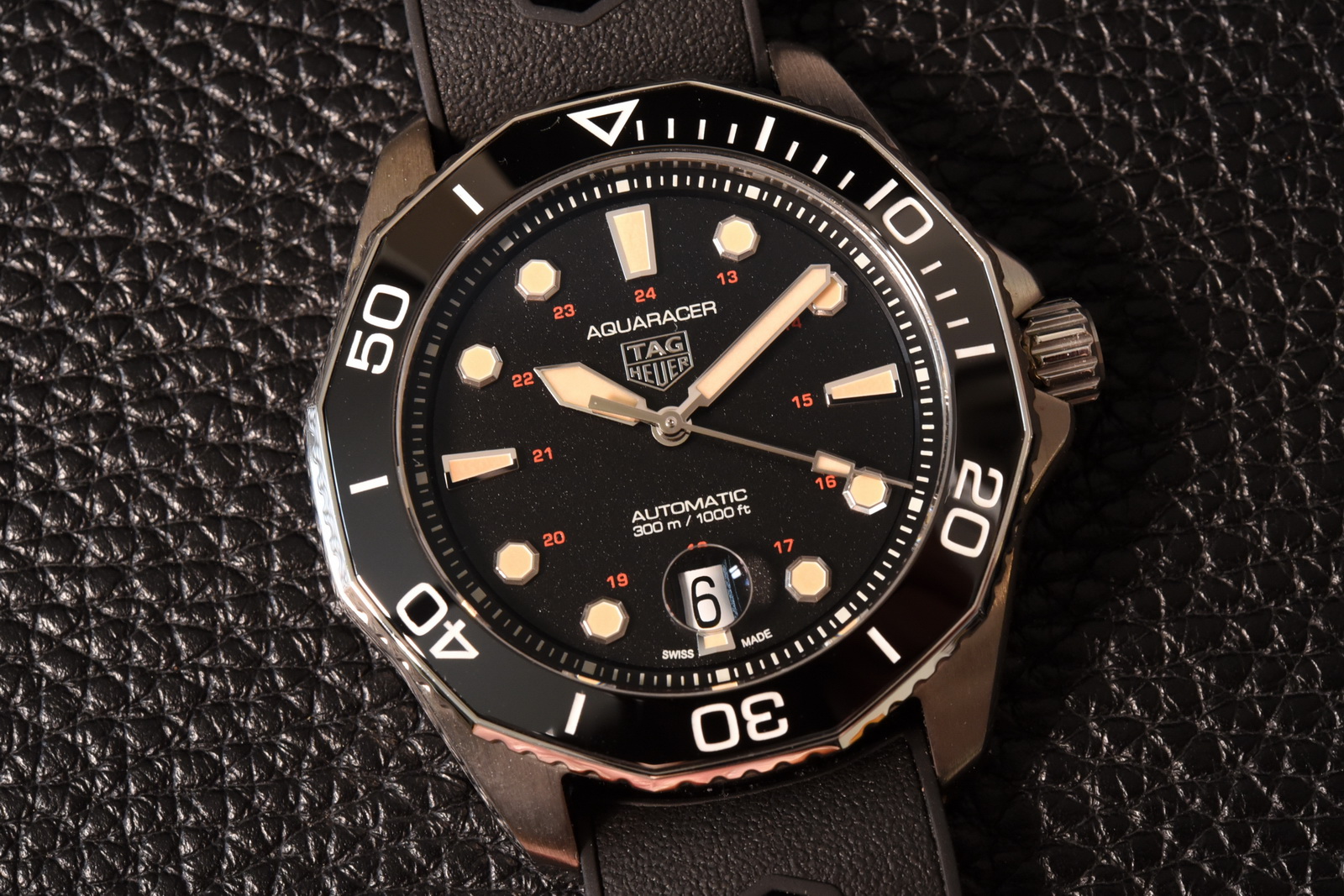 Included among the 43 millimeter models of the new Aquaracer is a limited edition model that will catch the eye of the vintage Heuer enthusiasts. TAG Heuer has gone back to the very first dive watch that it created, in 1978, to offer a tribute to the Reference 844 dive watch. The dials of the standard-issue Aquaracers have a ribbed finish, with horizontal lines, but the dial of the Reference 844 is a matte, orange-peel finish. In place of the bright white lume on the dial and hands of the standard models, the Tribute to Reference 844 has a rich, creamy tone, consistent with the vintage predecessor. The signature element of the earliest Reference 844 dive watches was the numerals 13 through 24 printed in bright red, and the tribute carries forward this element.