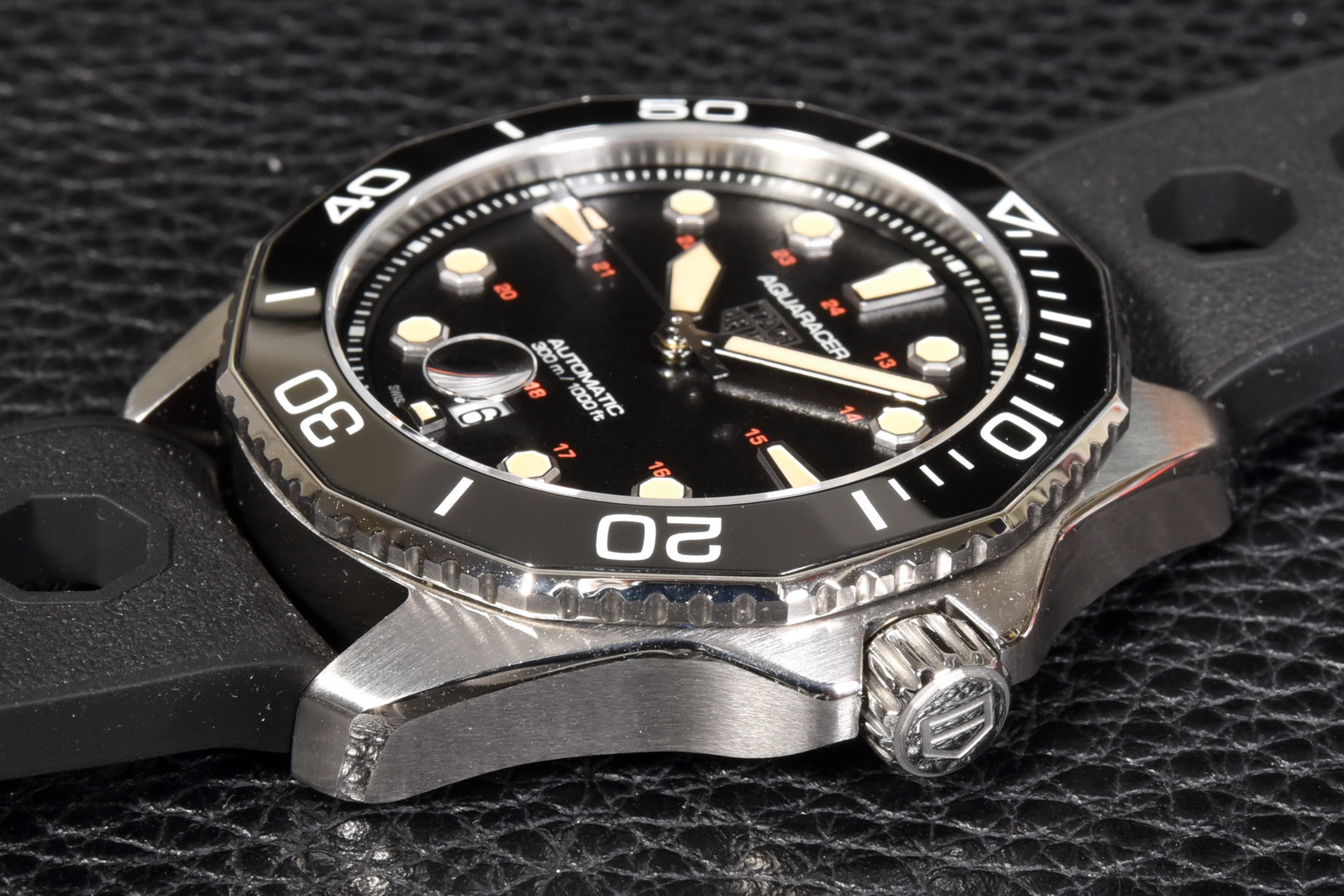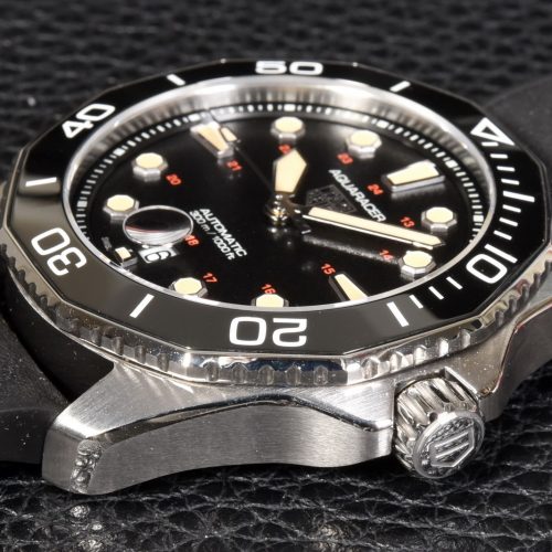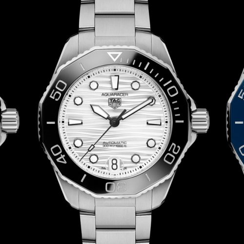 On April 7, 2021, TAG Heuer introduced an updated version of the Aquaracer, with the new models — called the Aquaracer Professional 300 — representing the fifth generation of the Aquaracer. The larger model measures 43 millimeters across the dial, but is thinner and lighter than the previous generation of Aquaracers. Cases are stainless steel, and the 12-sided bezel has a ceramic insert. The dials have horizontal lines, consistent with the ribbed look of previous models of the Aquaracer. The markers for the hours have been restyled, as octagons, surrounding the bright white luminous inserts. The date window has moved from the traditional position on the right side of the dial (at 3 o’clock) to the bottom of the dial (at 6 o’clock), with the magnification provided by a lens under the sapphire crystal, so that the top of the crystal is smooth.