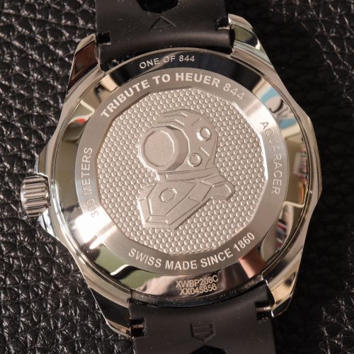 The Aquaracer Tribute to Reference 844 takes a different approach. Rather than celebrating a racer, a team or a sport, the new Aquaracer pays tribute to a moment in the history of the Heuer brand, the moment when Jack Heuer decided that there was a good opportunity for Heuer to offer moderately-priced, good-quality dive watches. The Heuer Reference 844 dive watch was created in that moment.