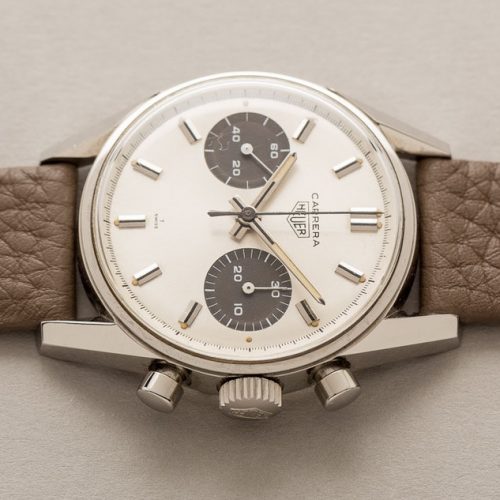 When the Heuer Carrera was introduced in 1963, there were two versions of the chronograph. The Carrera 12 was a three-register chronograph, powered by the Valjoux 72 movement. The Carrera 45 was a two-register chronograph, powered by the Valjoux 92 movement. The Carrera 30, Reference 7753, came in 1970, when Heuer began using the Valjoux 7730 movement.
