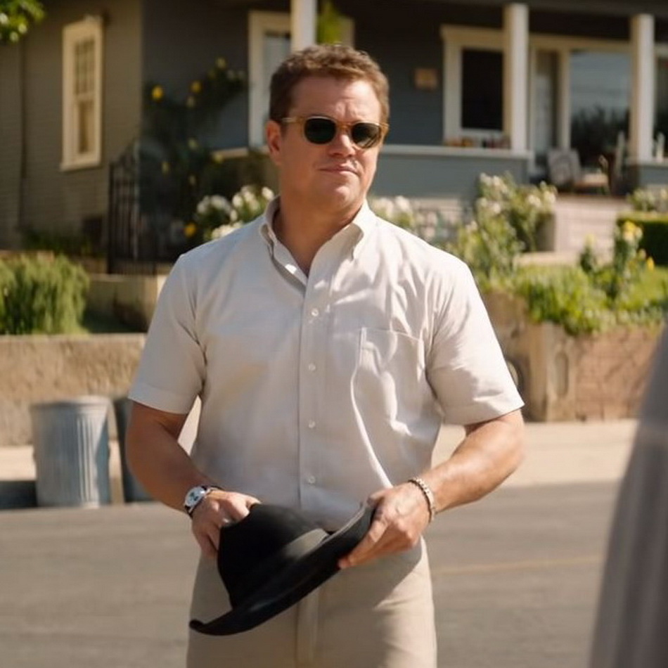 In terms of the watch spotting, Damon provides an easy target. We see him wearing what can only be a two-register Heuer Carrara, with a white dial and black registers, the Reference 7753.