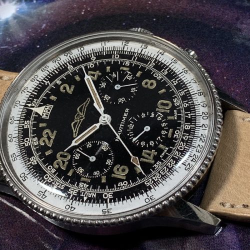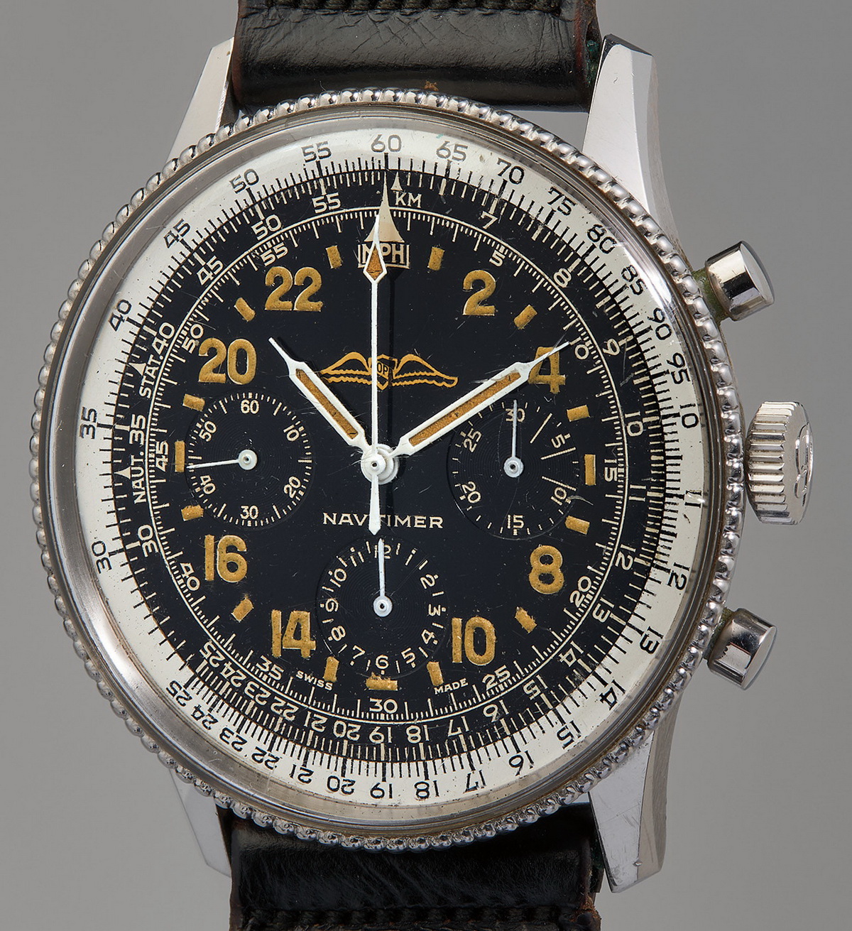 Starting with the standard-production Navitimer, the chronograph that Carpenter wore had three significant modifications – (1) 24-hour indication, rather than 12-hour indication (as discussed above); (2) a simplified slide rule, which deleted the Hours / Minutes scale (HH:MM) scale, used to make time / distance computations (which would not be useful in space travel), and (3) a wider rotating bezel, so that an astronaut wearing thick gloves would be able to operate the slide rule.