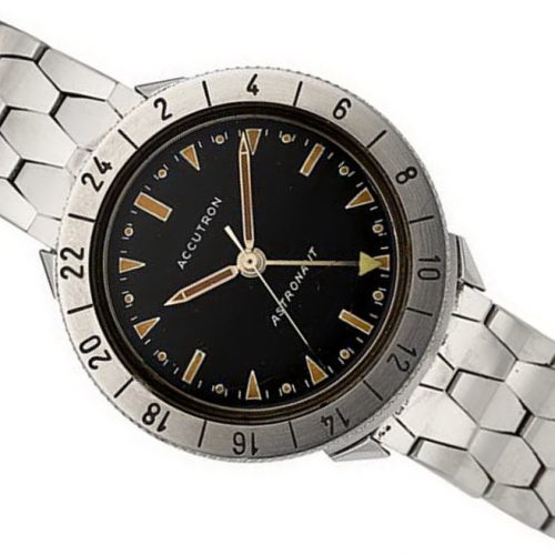 Bulova introduced its Accutron tuning fork watch in 1960. The model that came to be known as the “Astronaut” had normal 12-hour time indication, but featured a rotating 24-hour bezel and a fourth hand that took 24 hours to rotate around the dial (sometime called a “GMT hand”). The user could rotate the bezel to select a specific time zone and then read that time in that second time zone using the GMT hand. The watch had no crown, but the time was set using a recessed “key” on the caseback next to the battery compartment. A distinctive stainless steel bracelet has coffin-shaped links. This model of the Accutron was issued to X-15 test pilots and the Mercury Seven astronauts, and during 1962 the name “Astronaut” was added to the dial.