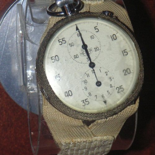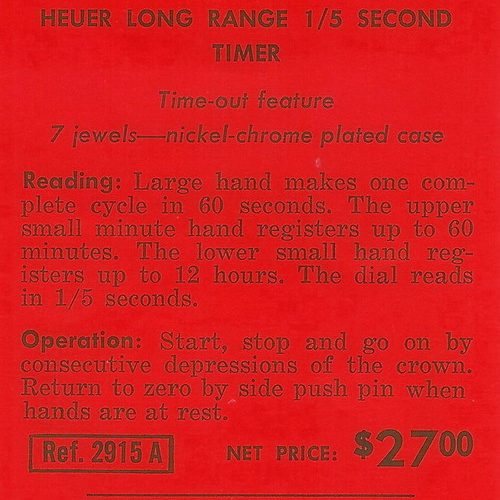 Heuer catalogs describe the Reference 2915 A stopwatch as a “Long-Range 1/5 Second Timer”. The “long-range” refers to the fact that the stopwatch has 12-hour capacity, and the “1/5 Second” refers to the fact that the stopwatch displays 1/5 second increments.